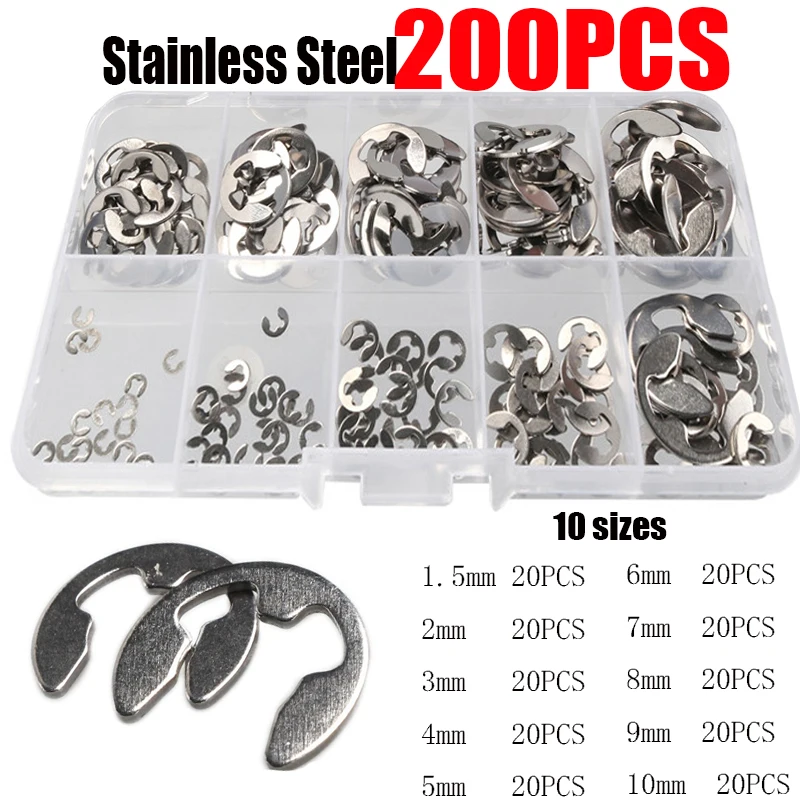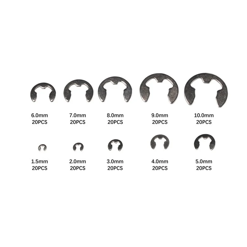 - Kit includes 200 stainless steel E-clips with sizes from 1.5mm to 10mm, each size containing 20 pieces for versatile applications across various machinery needs.