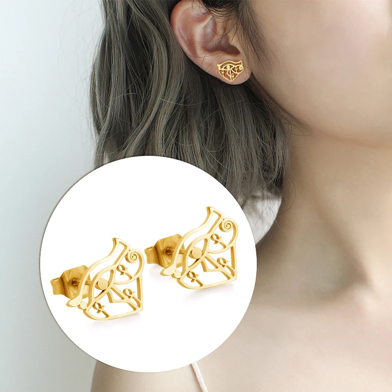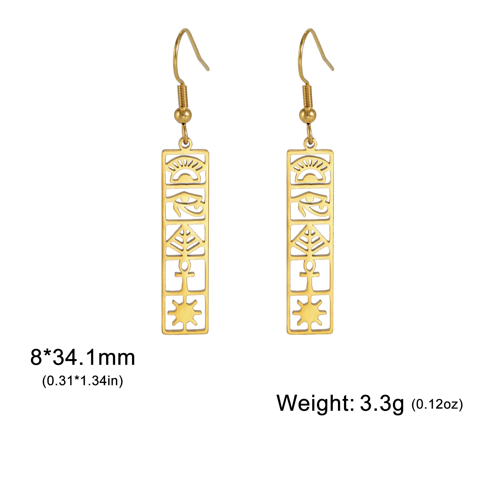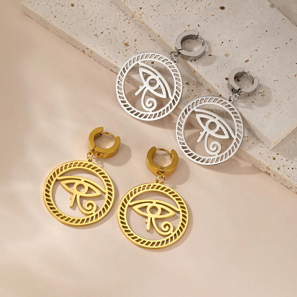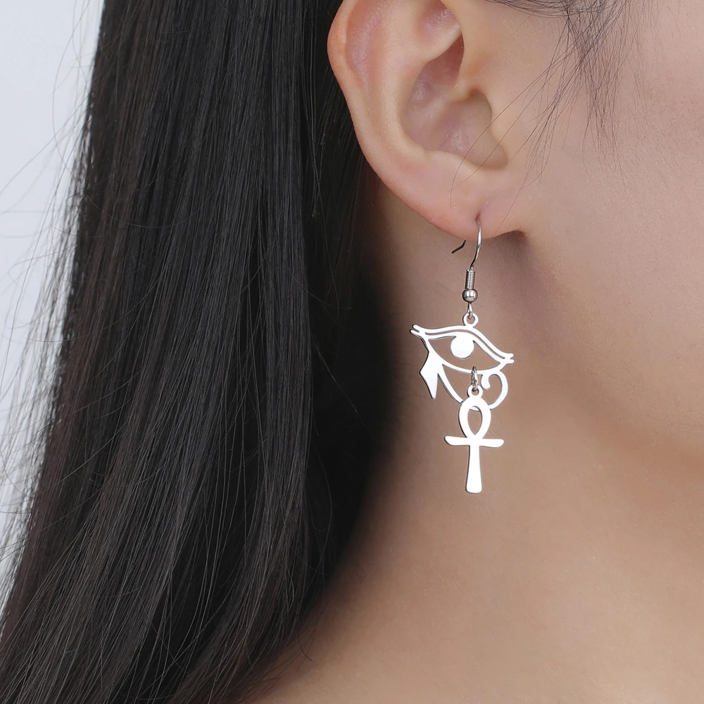 Experience the timeless elegance of these stainless steel drop earrings, featuring a sleek geometric design inspired by ancient Egyptian symbols. Available in steel, gold, and gold-tone variations, each pair showcases a polished Eye of Horus and Ankh cross, symbolizing protection, health, longevity, and life. Crafted with a minimalist yet meaningful aesthetic, these earrings are suitable for women, men, and couples who appreciate cultural heritage blended with modern fashion. Their durable stainless steel construction ensures a shiny, smooth surface that enhances their metallic sheen. Perfect for elevating any look, these classic earrings come with free shipping and are an excellent choice for those seeking symbolic jewelry with versatile style.