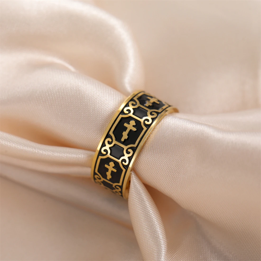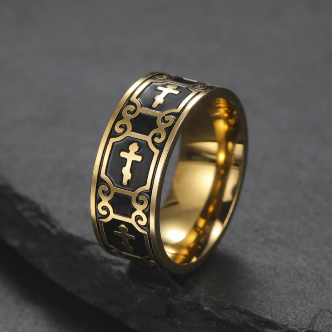Experience the timeless elegance of this unisex filigree cross ring, expertly crafted from durable stainless steel. With a broad 8mm band, it features intricate cross and scrollwork engravings that wrap around the entire circumference, creating a sophisticated and religious aesthetic. Available in stunning gold and silver finishes, each ring is accented with black insets in the engraved patterns to enhance visual contrast and highlight detailed craftsmanship. The polished surface offers a smooth, shiny look that complements both casual and formal outfits. Designed to be comfortable yet bold, this ring is perfect for everyday wear, special occasions, or as a meaningful gift. Its versatile style reflects both faith and fashion, making it an essential addition to your jewelry collection.