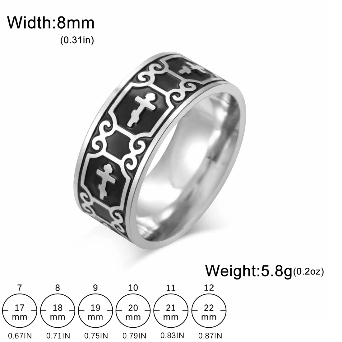 - Technical specifications include: corrosion-resistant, hypoallergenic stainless steel; surface width 8mm; available in size 7-13 with specific inner diameters; resistant to acids and alkalis; does not deform or fade over time.