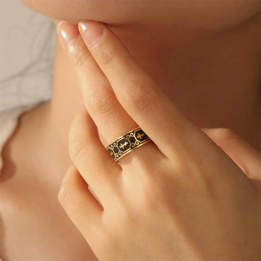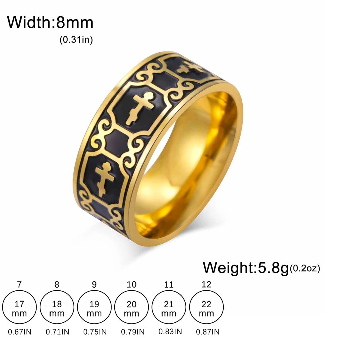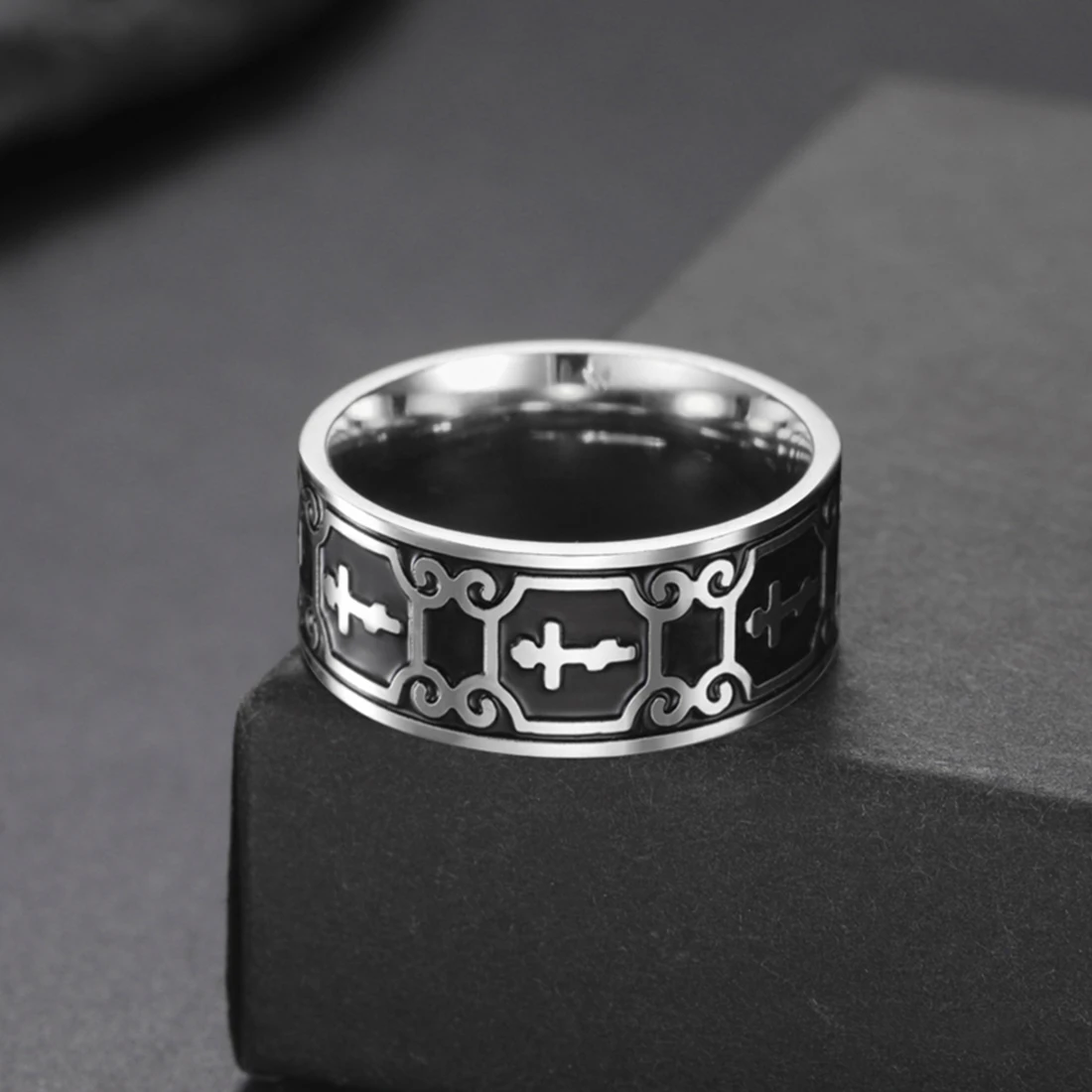 - Features an 8mm wide band with detailed filigree cross and scrollwork engraved around the entire outer circumference for an ornate, religious-inspired look that exudes sophistication and elegance.