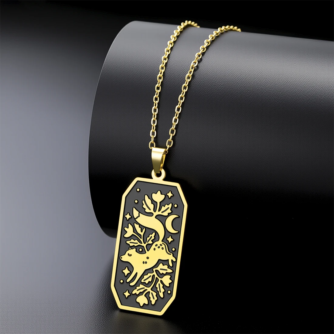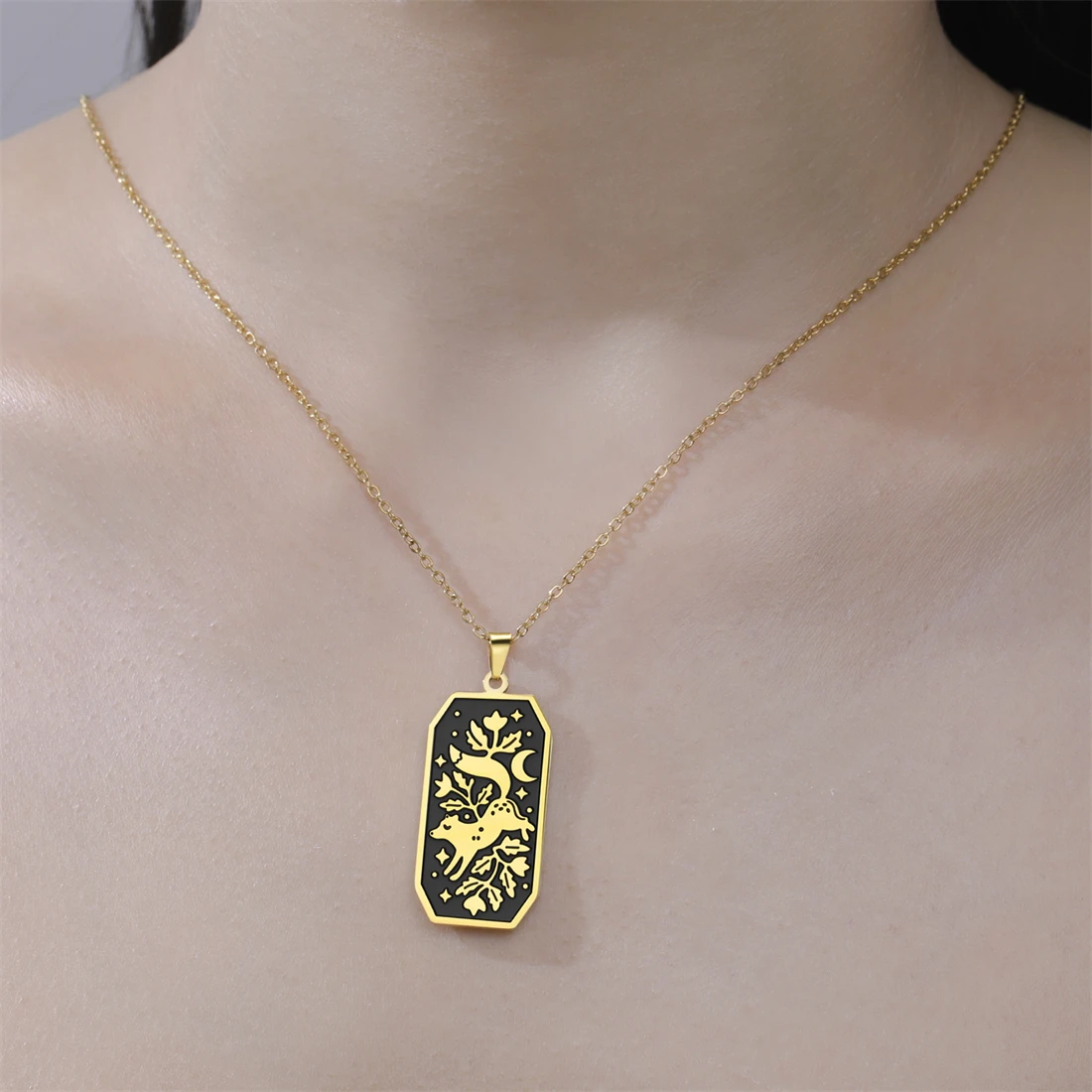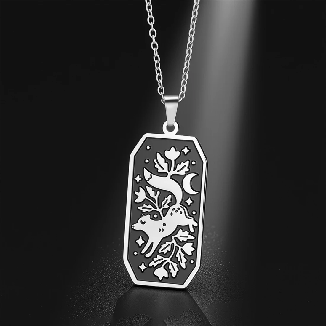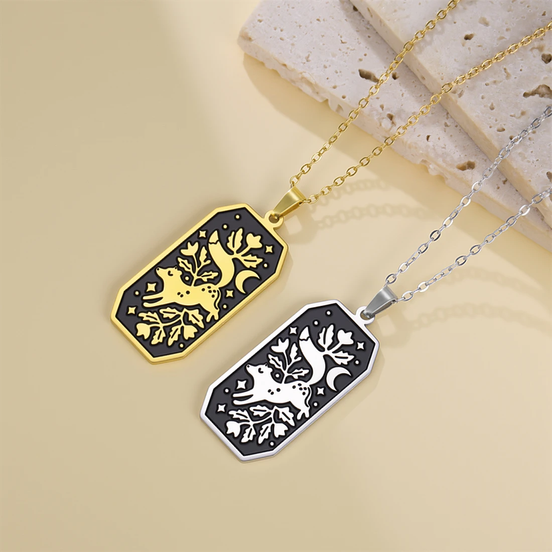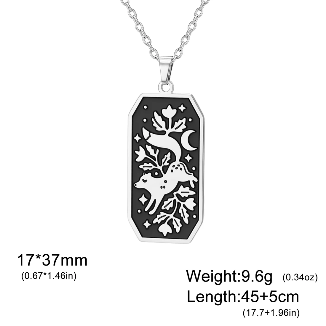 This stylish unisex stainless steel necklace features a 17×37 mm elongated rectangular pendant with an intricate floral fox design, available in silver and gold finishes. The 45+5 cm link chain offers a comfortable fit, highlighting the sleek and glossy look of the durable, corrosion-resistant, non-allergenic, anti-acid, and alkali stainless steel material. Its vintage-inspired yet modern aesthetic makes it perfect for parties, birthdays, anniversaries, or everyday wear. With a sleek, minimalistic charm, this necklace seamlessly combines fashion and sophistication, ensuring it remains a timeless addition to any jewelry collection.