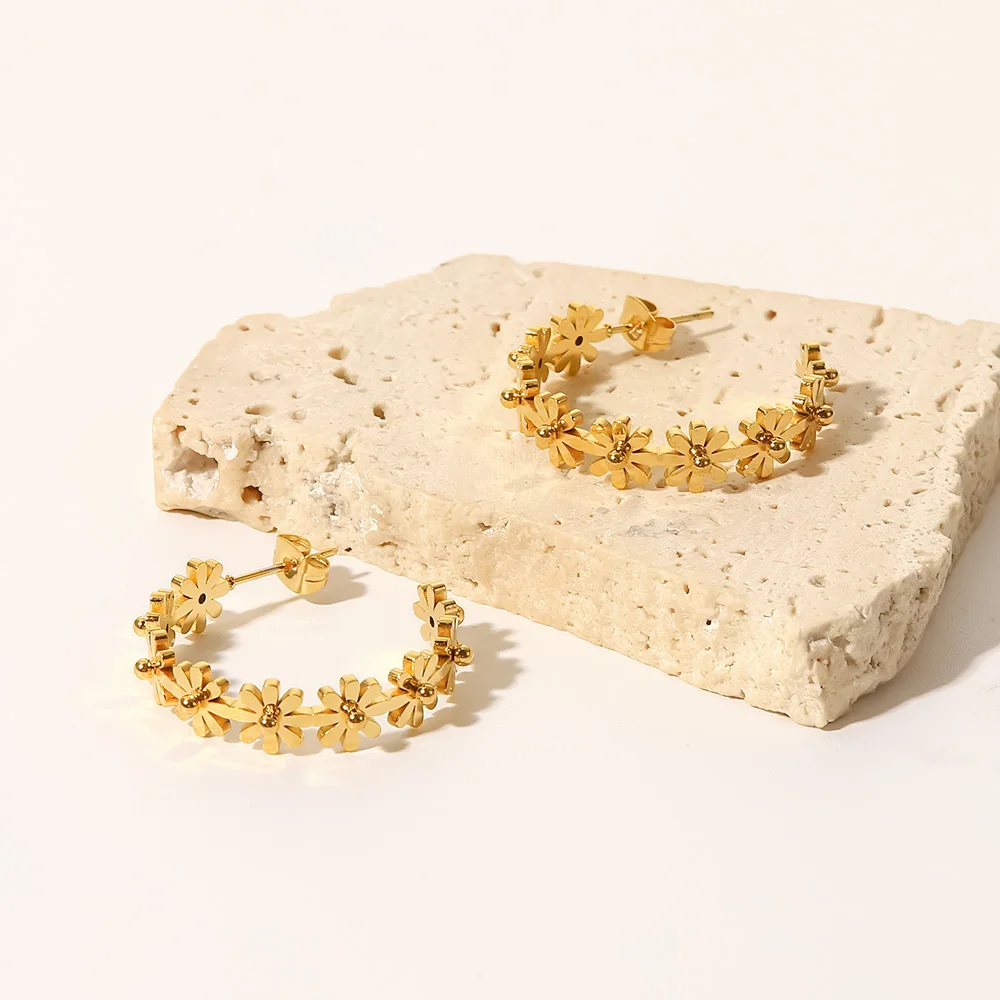 Elevate your accessory collection with these trendy stainless steel hoop earrings, featuring a 2 cm diameter and 1.5 cm width. Crafted from durable, nickel-free stainless steel with a PVD gold finish that lasts for years, these earrings resist fading and scratches. The playful, chunky “CC” circular design, accented by small floral charms with a raised center, adds a bold, fashionable statement to any look. Waterproof and suitable for multiple occasions, they combine youthful charm with an elegant touch, perfect for women who want to stand out with jewelry that balances style and durability. Weighing around 15 grams, these earrings are designed for those seeking a modern, eye-catching accessory.