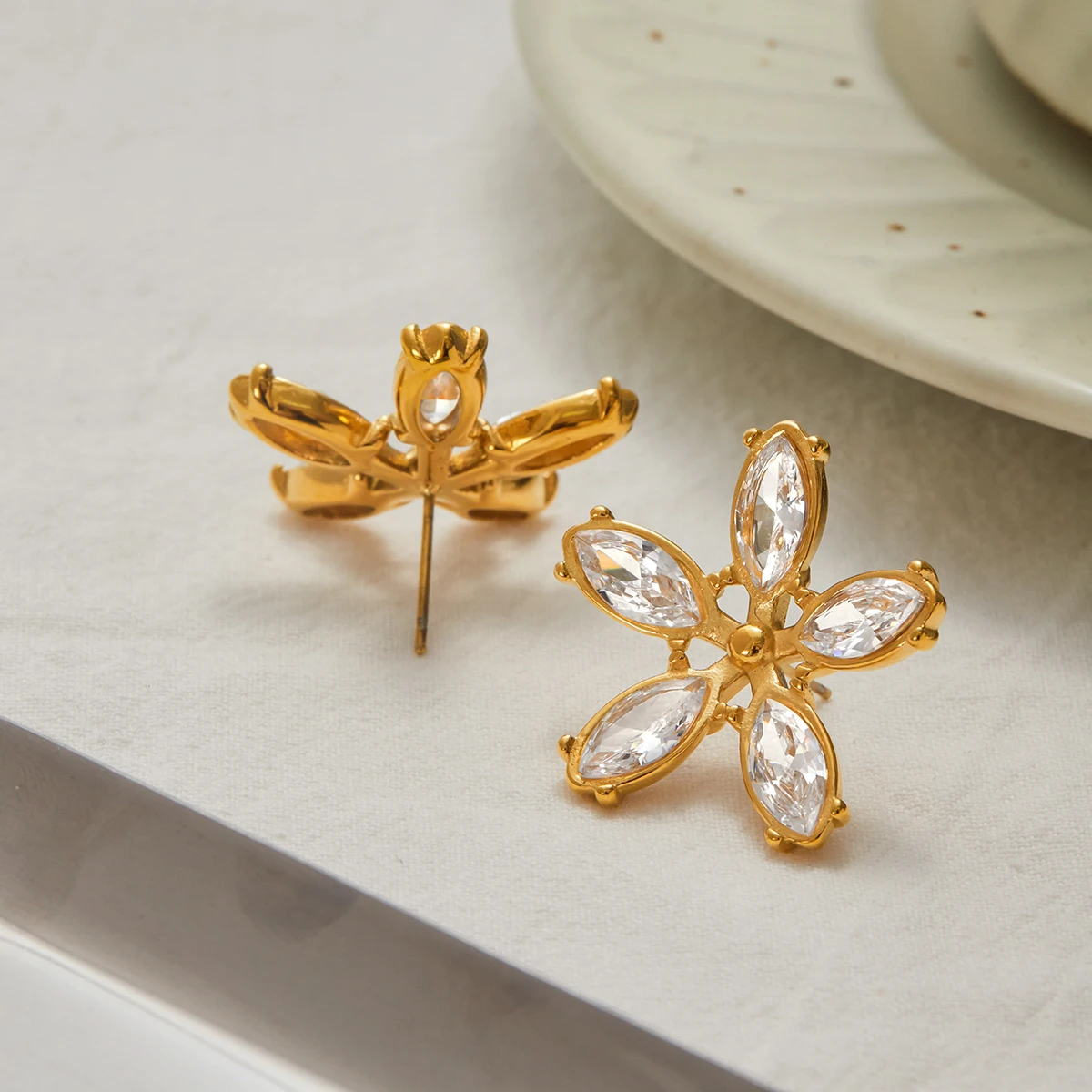 - The large earrings feature faceted gemstones shaped like flowers, mounted on a gold-tone base, offering sparkling clarity and captivating light reflection.