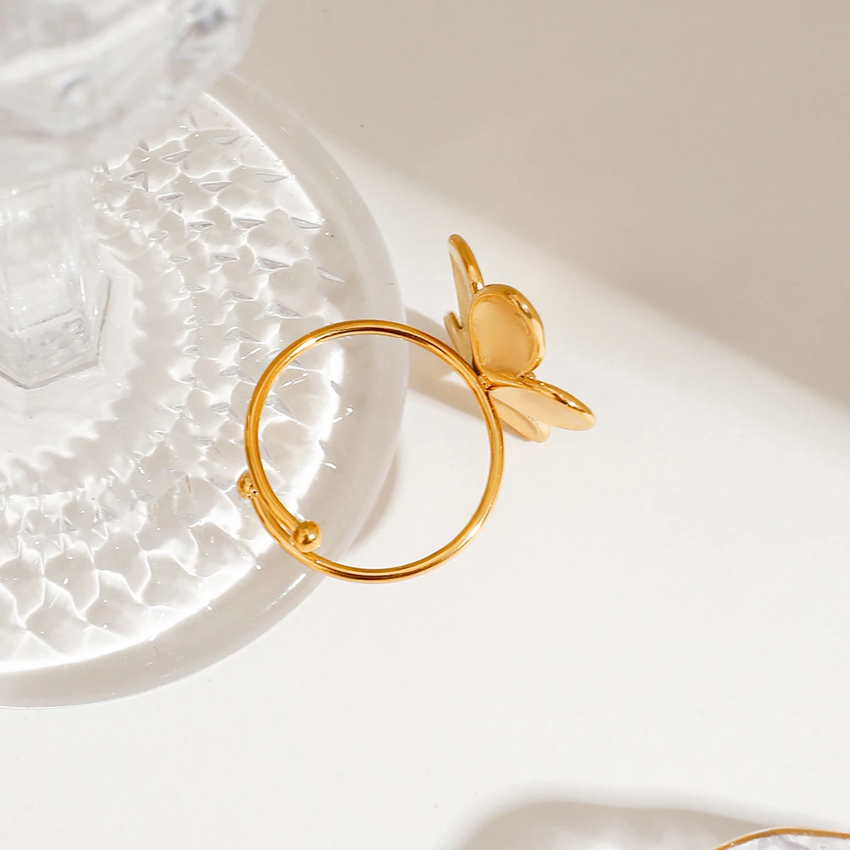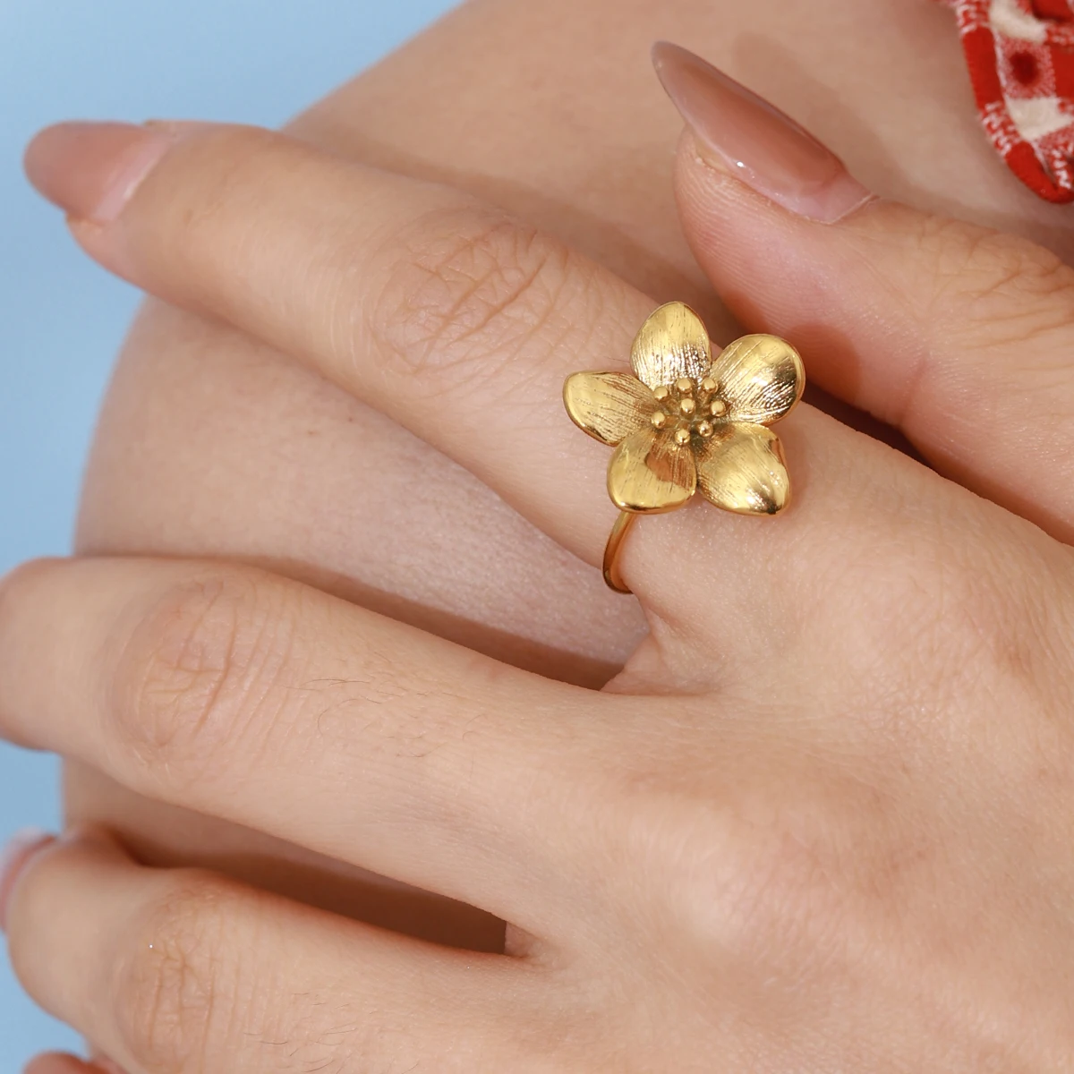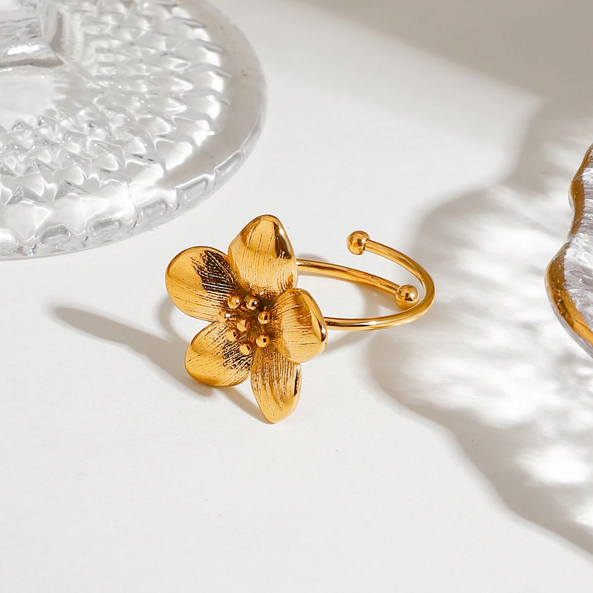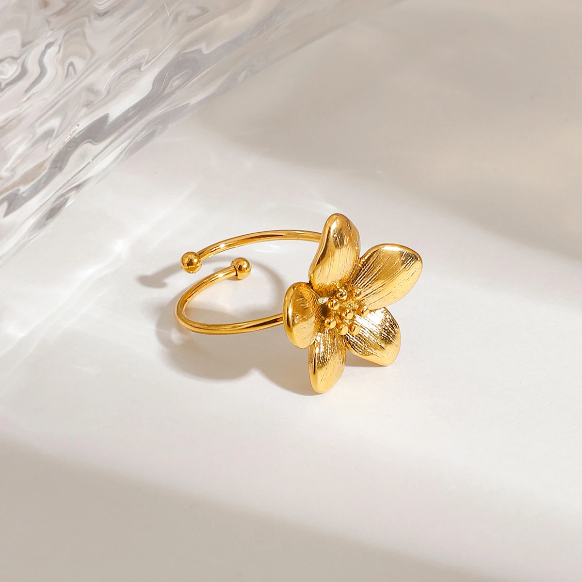 This exquisite stainless steel floral open ring in gold features a detailed three-dimensional flower motif with five convex, textured petals resembling natural veining, and small spherical beads at the center for added intricacy. The sleek, thin circular band measures size 7 for a universal fit and ends in small spherical tips for enhanced comfort and elegance. Crafted with high-quality durability, this ring offers a luxurious and delicate aesthetic, perfect for elevating any look. Its vibrant, lustrous finish catches the light beautifully, making it an ideal accessory for special occasions or everyday elegance. Model number JDR0211012 ensures a timeless, botanical-inspired design.