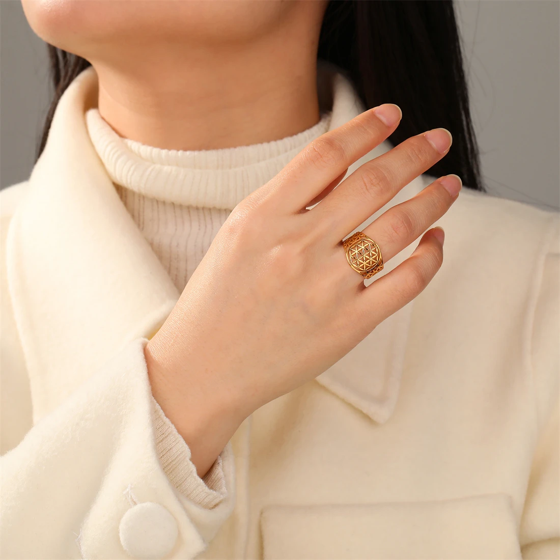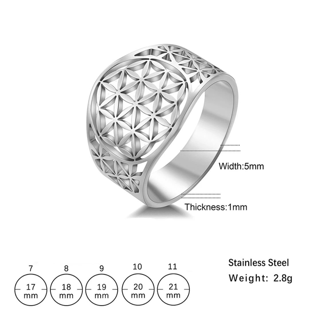 Envision yourself wearing this stunning ring, confident in its spiritual significance and refined craftsmanship. Its elegant design and high-quality build make it an accessory you'll cherish for years. Whether for personal spiritual growth or meaningful gifting, this ring adds a touch of symbolic beauty to any look. Experience the comfort and style that come with such a beautifully crafted piece, and let it remind you of interconnectedness and harmony in life's journey. Make this beautiful stainless steel Flower of Life ring yours now and enhance your jewelry collection with timeless elegance.