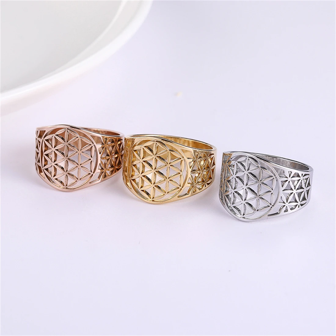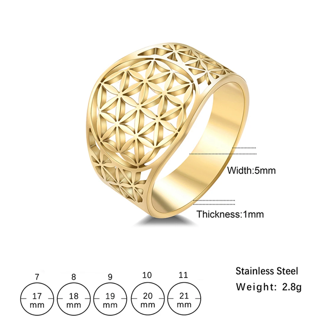 Experience the blend of divine symbolism and modern craftsmanship with this exquisite stainless steel ring featuring the sacred Flower of Life pattern. Designed to inspire and empower, this piece captures intricate geometric artistry with a polished, reflective finish. Available in three stunning colors—silver, gold, and rose gold—it complements any outfit, whether you're dressing up for a special occasion or adding a meaningful accent to your daily look. The wide 15mm band compliments the delicate lattice design, creating a bold yet elegant statement. Crafted from corrosion-resistant, non-allergenic stainless steel, this ring is durable, maintaining its shine and shape over time. It’s a versatile accessory that reflects your inner strength and spiritual beliefs.