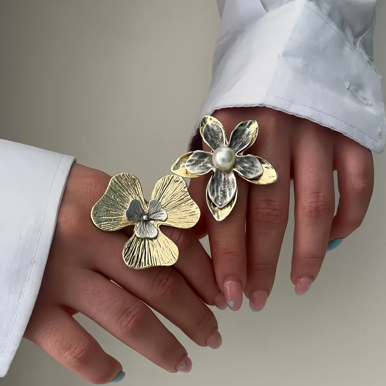 Experience the perfect blend of artistry and durability with this stunning stainless steel flower pearl ring. Crafted with attention to detail, it features a bold design with a five-petal floral motif. The petals boast a beautiful two-tone finish: the inner silver-colored textured surface delivers a handcrafted feel, while the smooth, polished gold-colored edges add elegance and shine. At the center, a lustrous pearl acts as the focal point, providing a refined touch to the statement piece. Its substantial size makes it ideal for those who love to showcase unique, artistic jewelry. Whether you're looking for a fashionable accessory or a distinctive bridal piece, this ring offers a sophisticated allure that elevates any outfit. Its versatile punk-inspired style makes it suitable for both everyday wear and special occasions, expressing confidence and individuality.