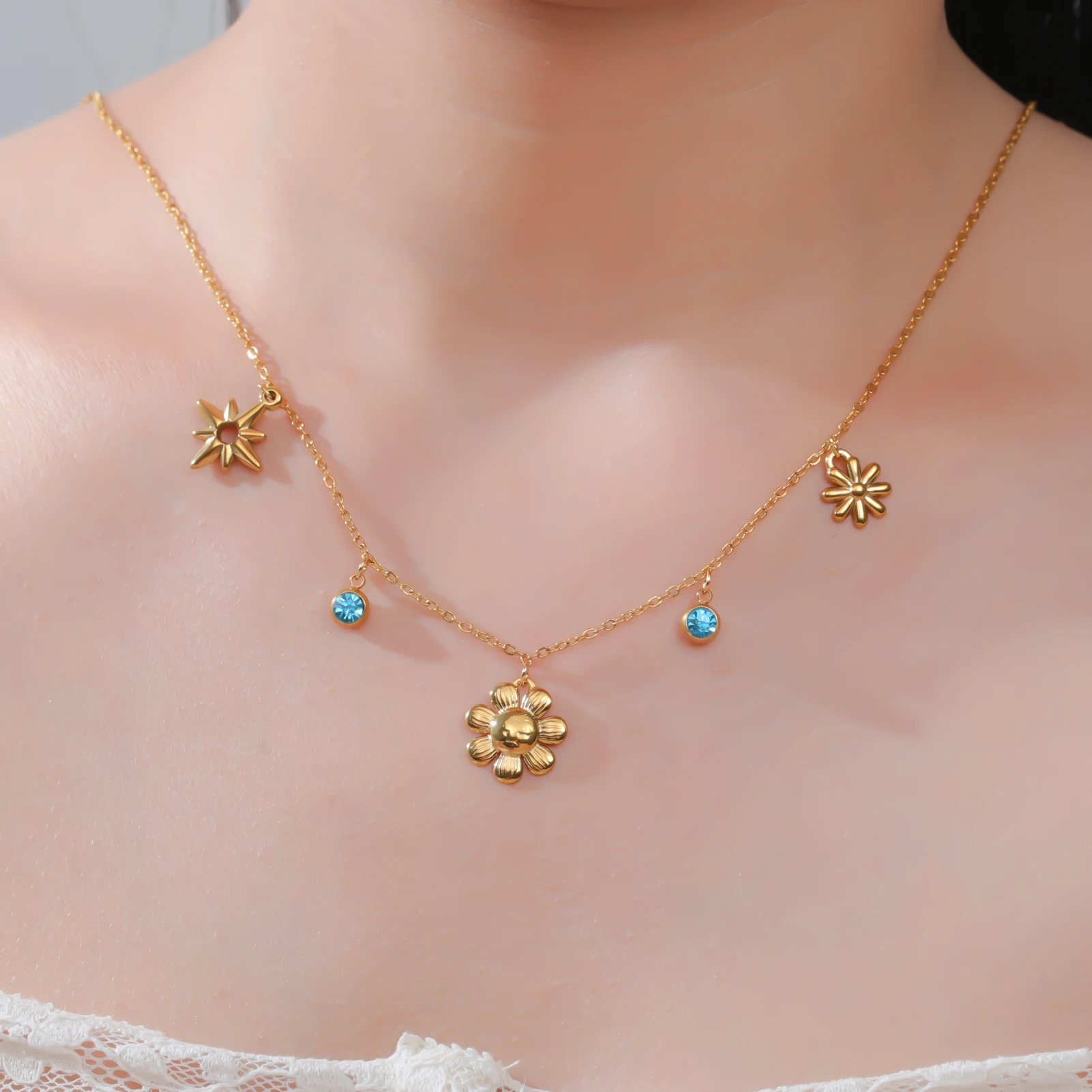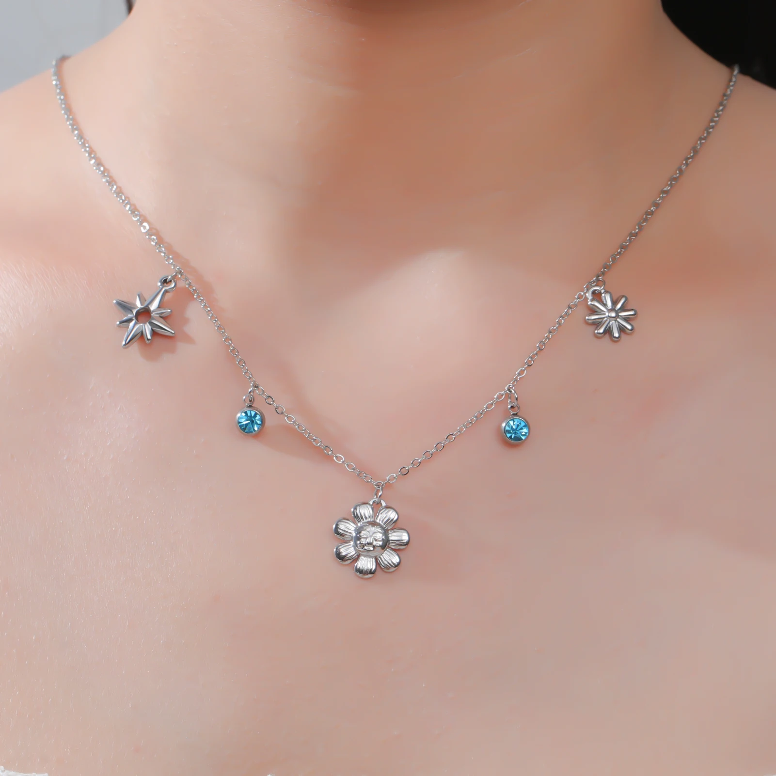 Imagine yourself radiating elegance and trendy charm with this beautiful necklace. Crafted with high-quality stainless steel, it features a delicate, fine chain adorned with vibrant blue rhinestones and intricate floral motifs. The central pendant, shaped like a blooming flower, is accentuated by shining metallic petals and a detailed face or motif in the center, emphasizing nature-inspired beauty. The versatile design blends bohemian aesthetics with modern fashion, making it perfect for daily wear or a special occasion. Its durable, hypoallergenic stainless steel ensures it remains shiny and untarnished over time, giving you confidence and style in one piece. Elevate your jewelry collection and enjoy the effortless elegance this necklace brings to your look.