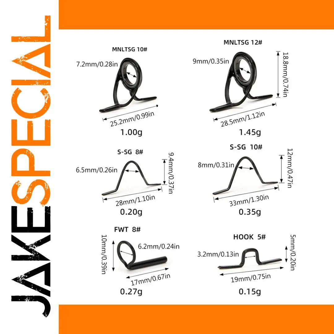 - Includes 11 guides: 1 x FWT8#, 4 x S-SG 8#, 3 x S-SG 10, 1 x MNLTSG 10#, 1 x MNLTSG 12#, and 5 x HOOK5#—perfect for various fishing applications.