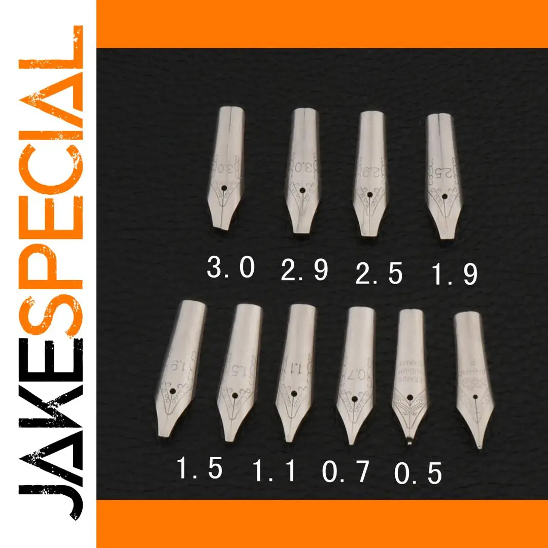 Experience the artistry and precision of this set of stainless steel fountain pen nibs, meticulously crafted to elevate your writing. Each nib features an elegant, polished metallic finish with intricate engravings that highlight craftsmanship and style. The nibs come in a range of sizes from 0.5mm to 3.0mm, offering you versatility in your writing — from delicate lines to bold strokes. Their pointed tips are designed for smooth, precise ink flow and comfortable handling, making them perfect for professional writing, artistic calligraphy, or personalized gift-making. Organized neatly in two horizontal rows, these interchangeable nibs are compatible with most standard fountain pens, allowing you to customize your writing experience effortlessly. Add sophistication and functionality to your stationery collection today.