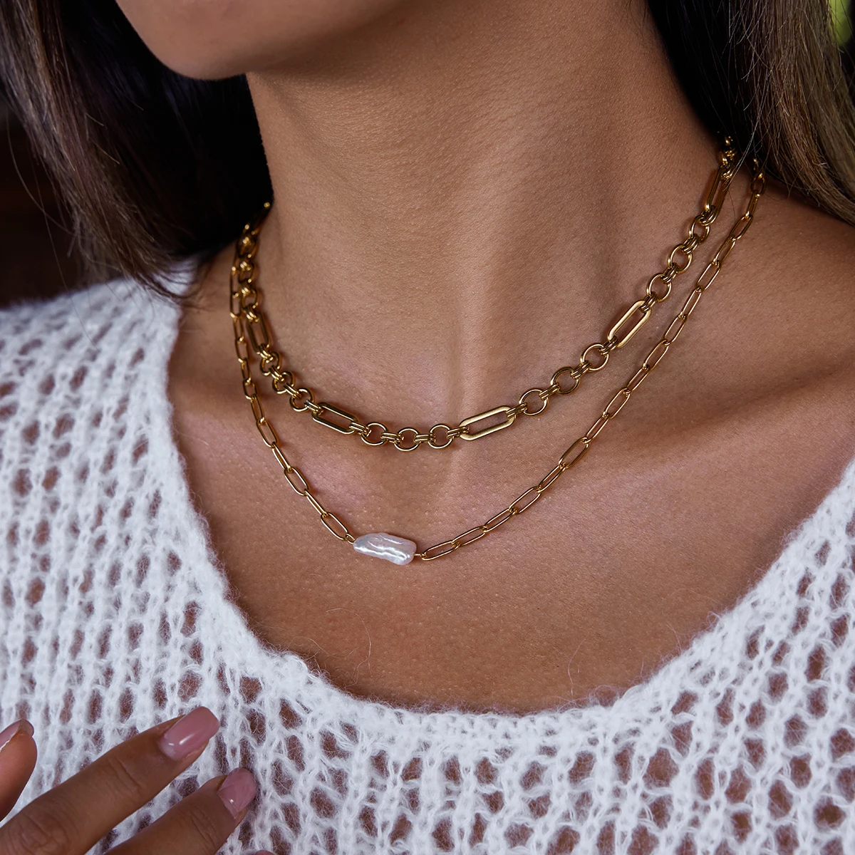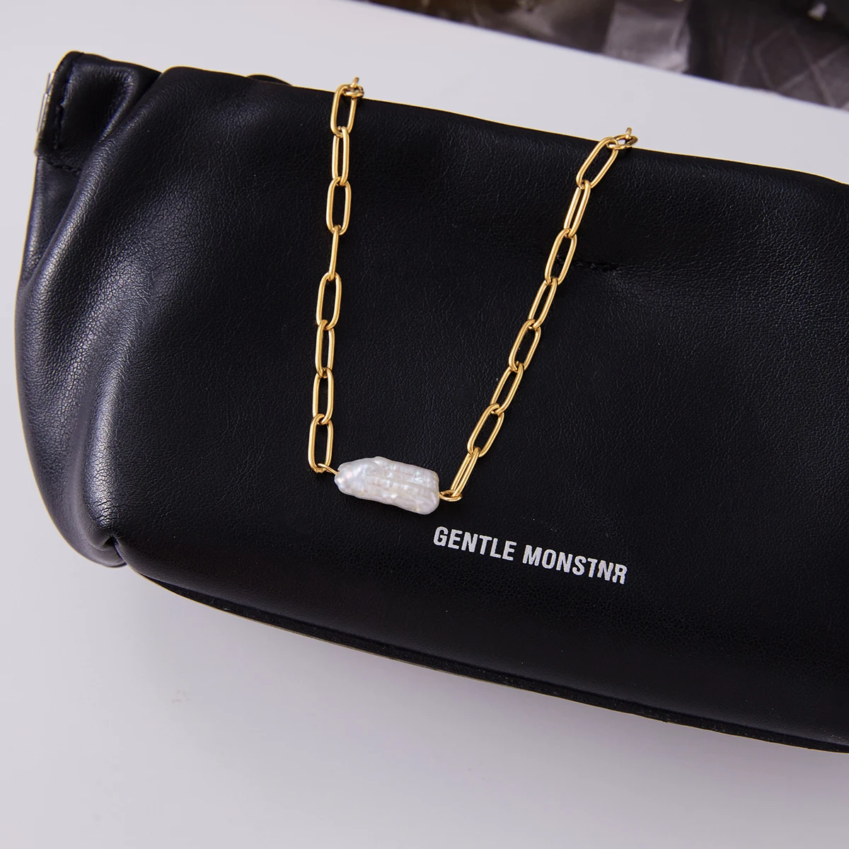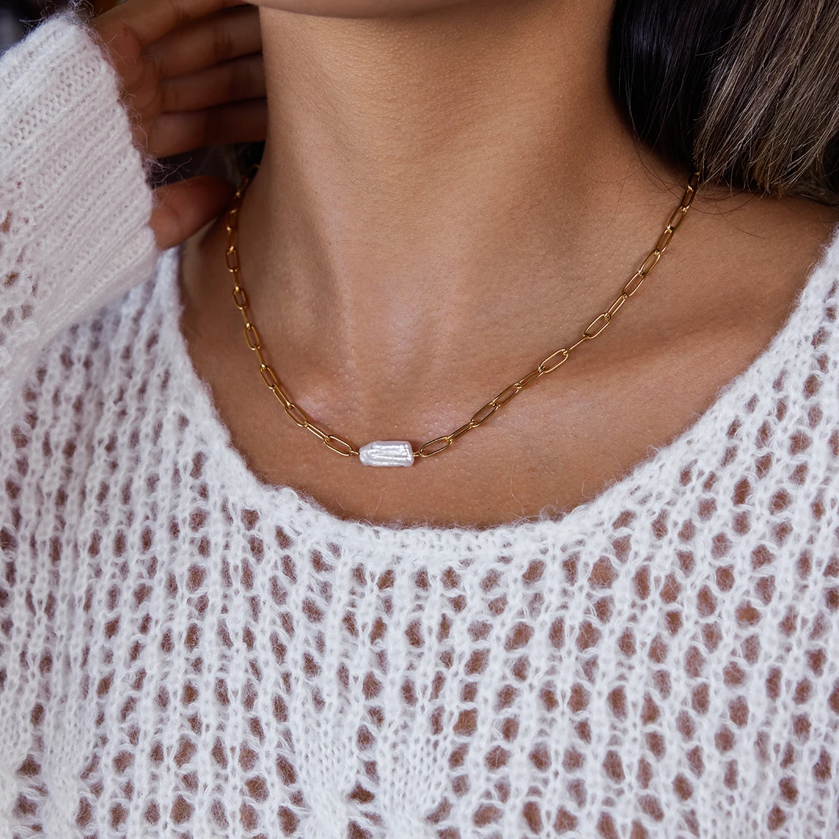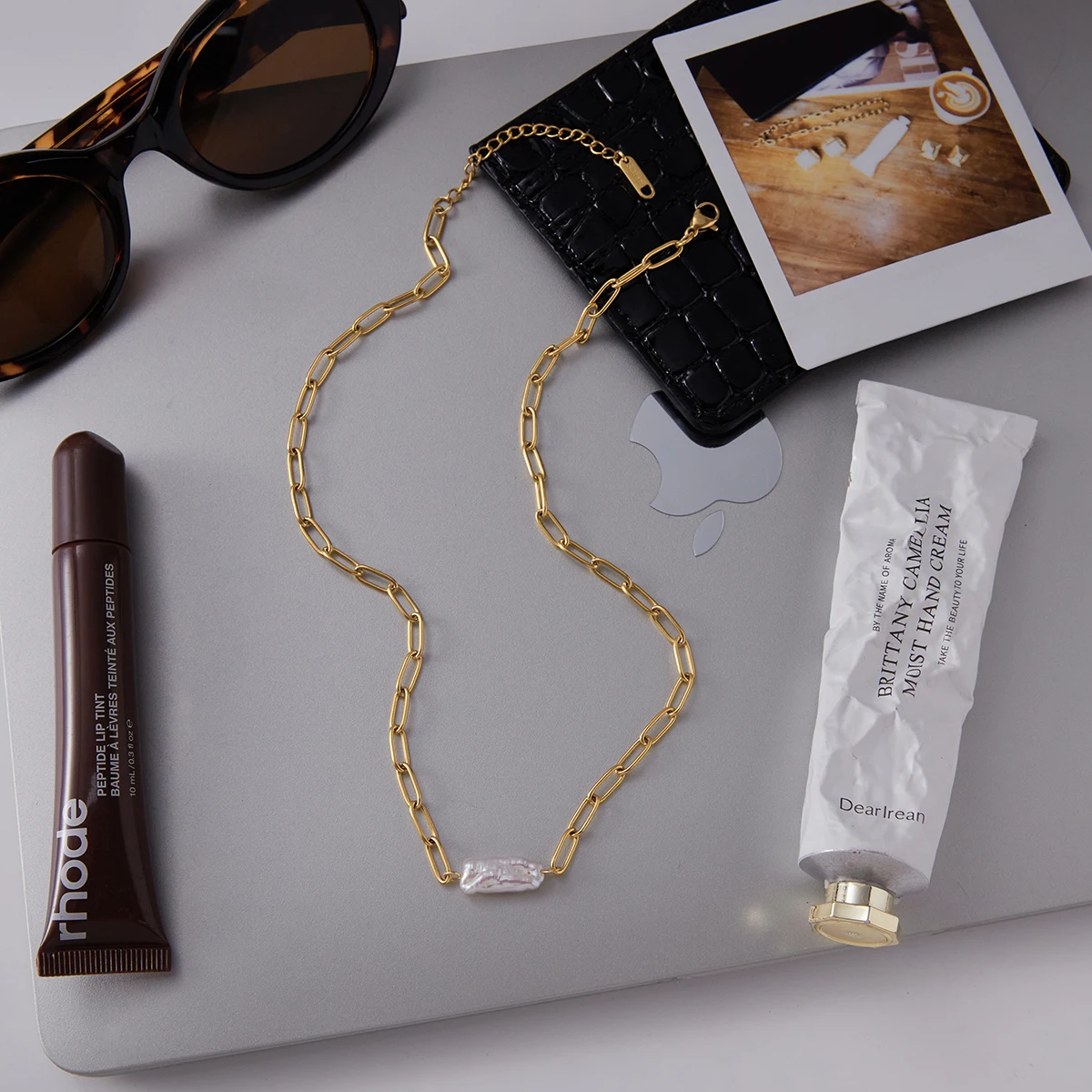 Experience the perfect blend of modern design and natural elegance with this women's freshwater pearl necklace. Crafted from high-quality stainless steel with a luminous gold coating, this accessory exudes luxury and sophistication. The chain features sleek, elongated rectangular links with soft, rounded edges, creating a contemporary geometric silhouette that complements any outfit. At its center, a uniquely textured freshwater pearl with an irregular surface and subtle iridescent shimmer adds an earthy charm, catching the light beautifully. Designed for versatility, the necklace sits comfortably at the collarbone, making it an ideal choice for both casual and formal occasions. Enhance your collection and enjoy effortless style every day or special night.