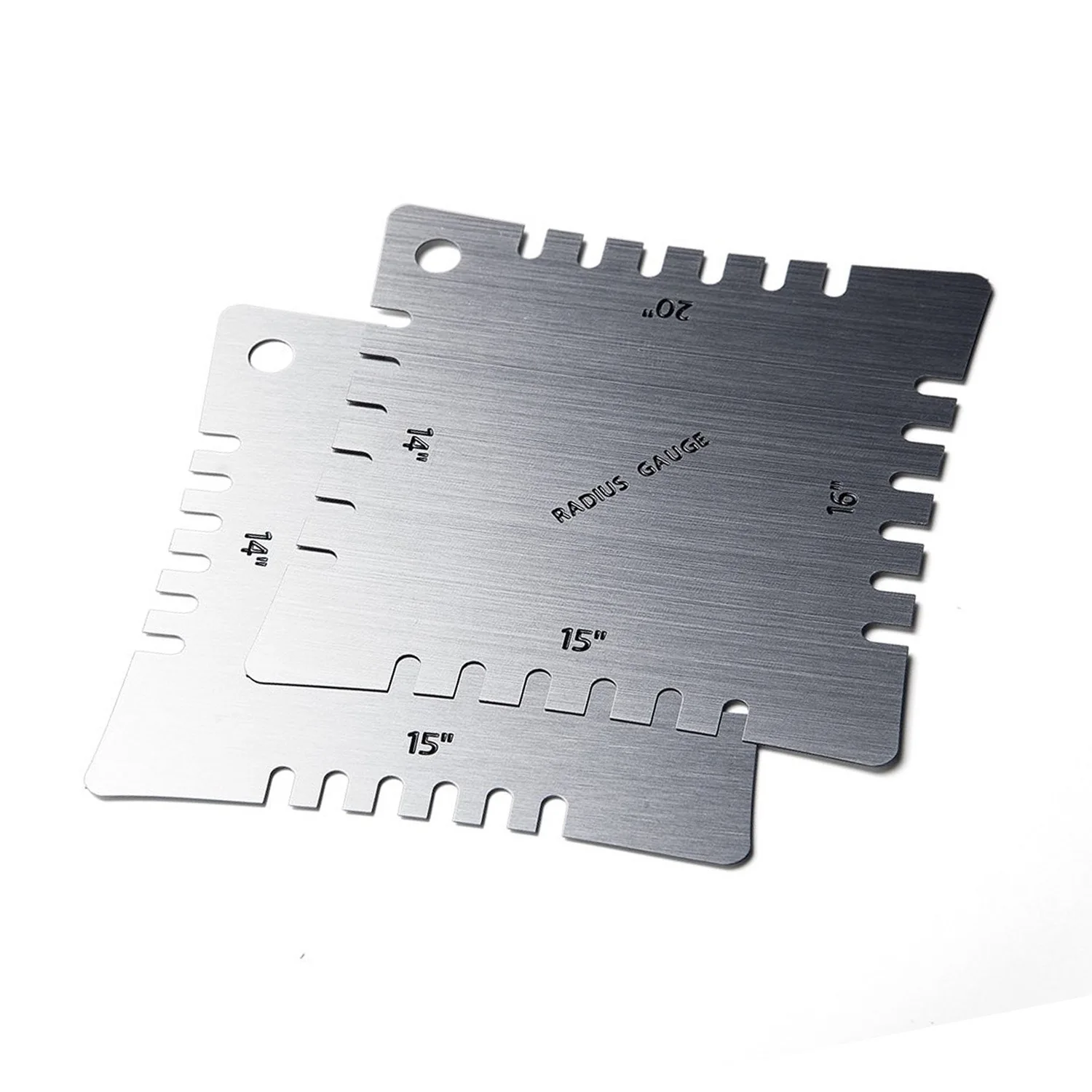 Experience professional-level maintenance with this set of four stainless steel guitar fingerboard fret arc leveling tools. Designed for accuracy, these tools help you precisely measure and level fret radii for optimal playability. Crafted from durable, corrosion-resistant stainless steel, they feature a sleek, polished finish that reflects quality craftsmanship. The engraved black markings clearly display radius measurements from 7.25 to 25″, ensuring easy reading during calibration. Rectangular notches along the edges serve as height gauges, making it simple to compare fret arcs. Small circular holes allow for convenient storage or hanging. Whether you are a DIY enthusiast or a professional technician, these tools bring confidence and precision to guitar setup and fret leveling work.