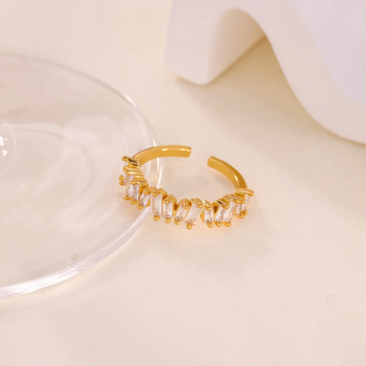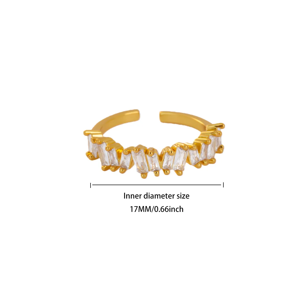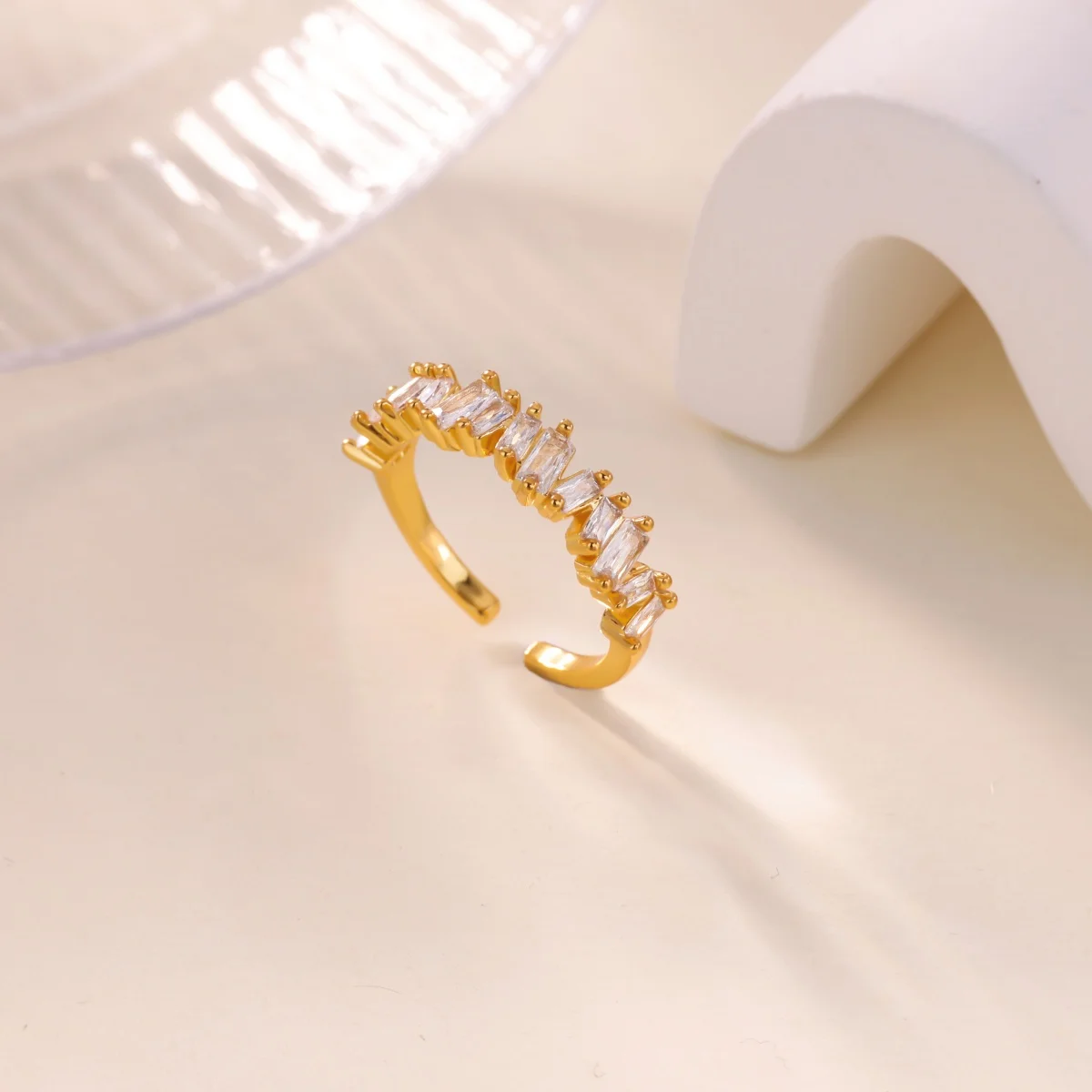 This luxurious stainless steel ring features a sleek, gold-tone finish with a 2mm wide open-ended band, designed to fit all finger sizes. Its modern geometric shape is accented by a striking arrangement of clear, baguette-cut zircon stones set along the top in a minimalist pattern without traditional prongs. Versatile and fashion-forward, it doubles as a mood tracker and makes an elegant accessory for parties, weddings, or as a couple’s or wedding band. The open design ensures comfort and adjustable fit, while the polished surface exudes contemporary sophistication, making it a perfect addition for those who appreciate refined, modern jewelry.