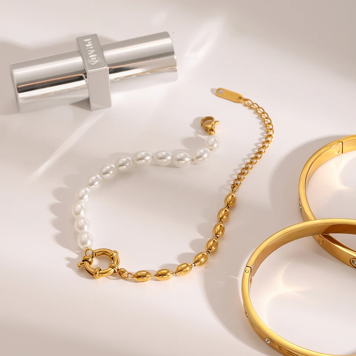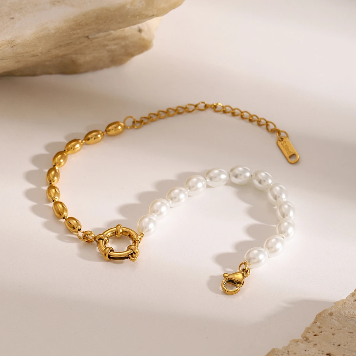 Discover the perfect blend of modern style and timeless elegance with this stainless steel bracelet. Its sleek, geometric oval shape creates a contemporary aesthetic, while luminous imitation pearls and polished gold beads add a touch of luxury. Crafted from durable stainless steel with a shiny, polished finish, this accessory is designed to resist water and corrosion, making it ideal for daily wear. The adjustable gold-tone chain ensures a comfortable, customized fit for any wrist size, and the small engraved tag adds a refined detail to the overall design. Whether dressing up or down, this bracelet effortlessly elevates your look and becomes a versatile staple in your jewelry collection.