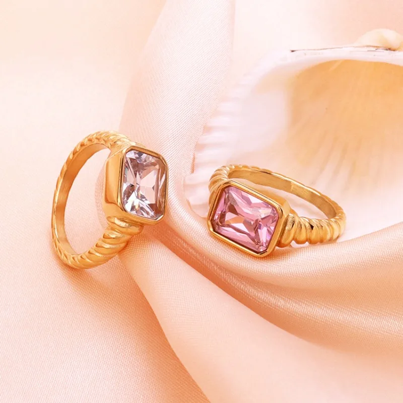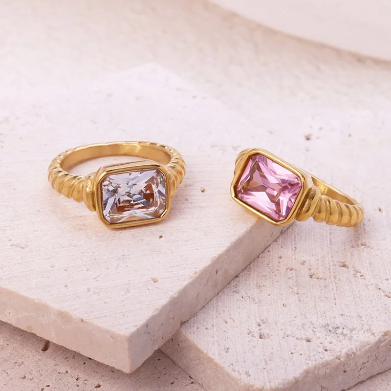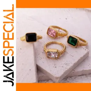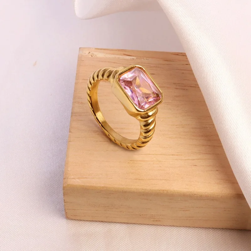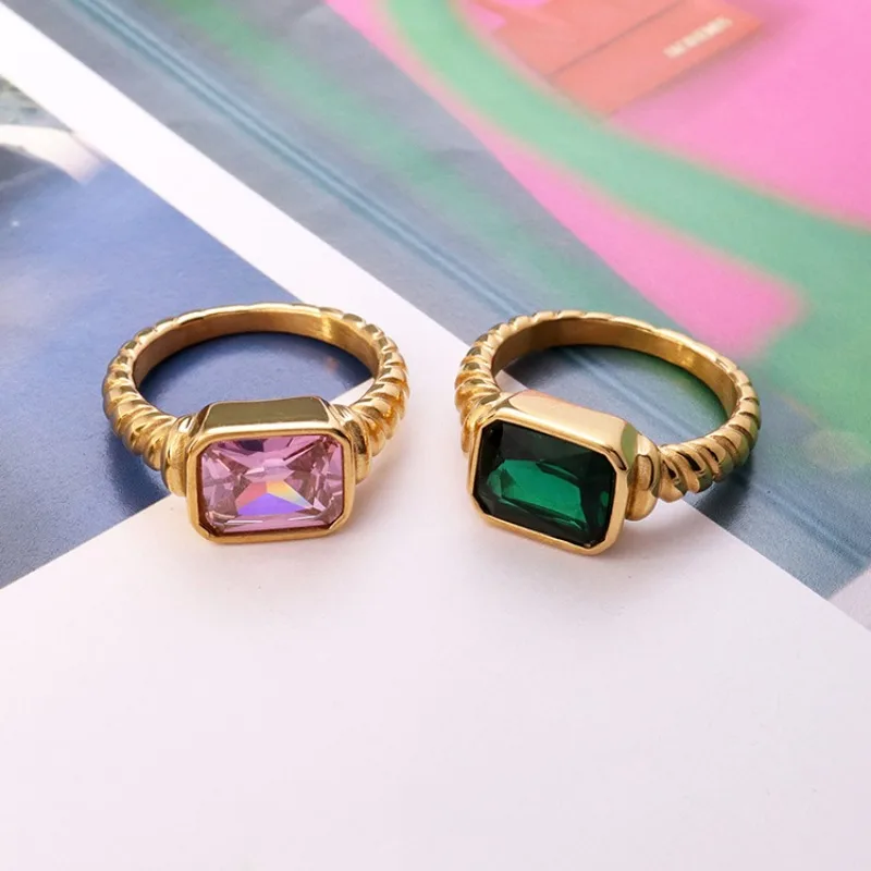Elevate your style with this trendy stainless steel cocktail ring featuring bold geometric design and inlaid cubic zirconia stones. Available in vibrant colors—pink, black, green, and white—and sizes 6, 7, and 8, it offers a fashionable, non-tarnish accessory perfect for engagement, parties, or special occasions. The ring’s chunky, layered gold-tone band with textured, ribbed details provides a chic, modern look that enhances any outfit. Its versatile style suits punk, gothic, or glamorous fashion statements, making it an ideal gift for friends, family, or yourself. Add a touch of bold elegance and personality with this captivating statement piece.
