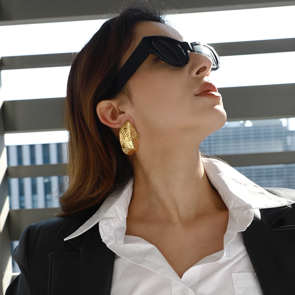 Elevate your everyday style with this pair of stainless steel geometric earrings. Crafted from high-quality, durable stainless steel, these earrings feature irregular, organic shapes inspired by natural pebbles or shells. Their smooth, rounded contours create a harmonious blend of natural elegance and contemporary design, making them versatile for any occasion. The textured surface, adorned with horizontal ridges and grooves, adds depth and visual interest, catching light beautifully. The polished, shiny finish enhances their luminous appeal and reflects light with sophistication. Designed to resist moisture and tarnishing, these waterproof earrings are perfect for busy lifestyles. The secure push-back closure ensures a comfortable, reliable fit, enabling you to wear them confidently whether at work or out on the town. Experience effortless style and lasting quality with these versatile accessories that seamlessly complement casual or elegant outfits.