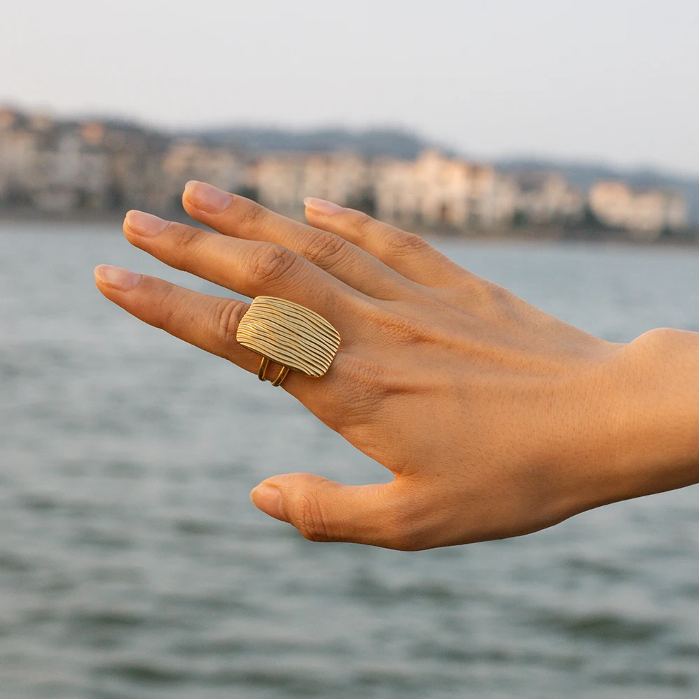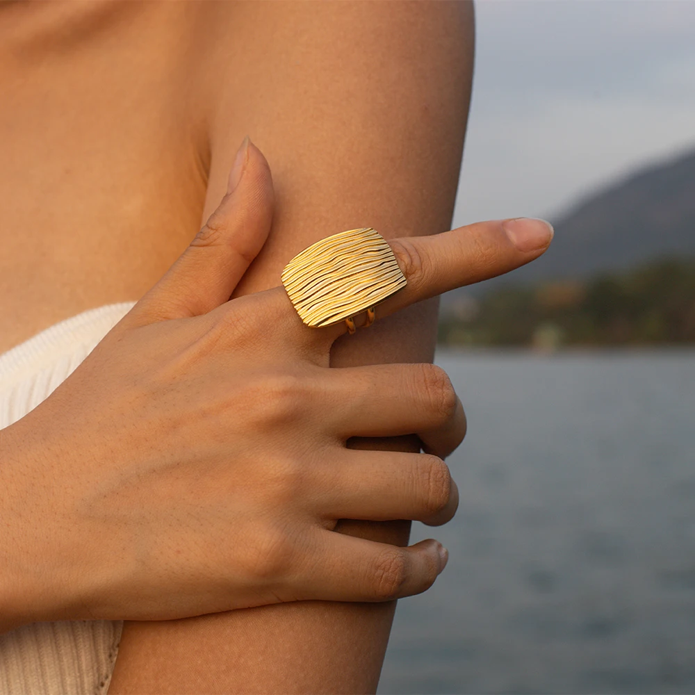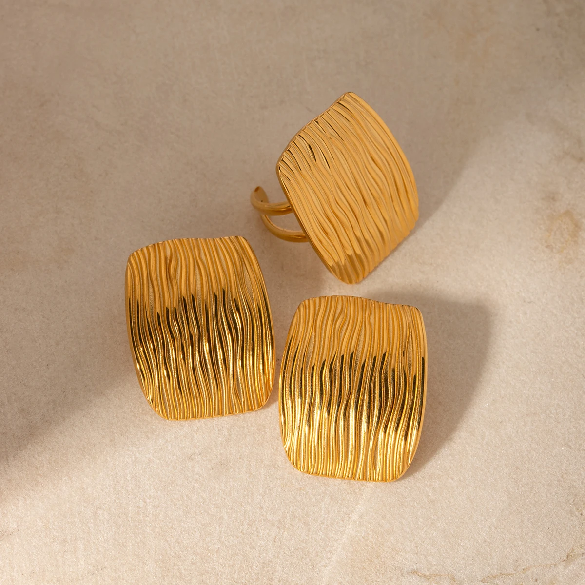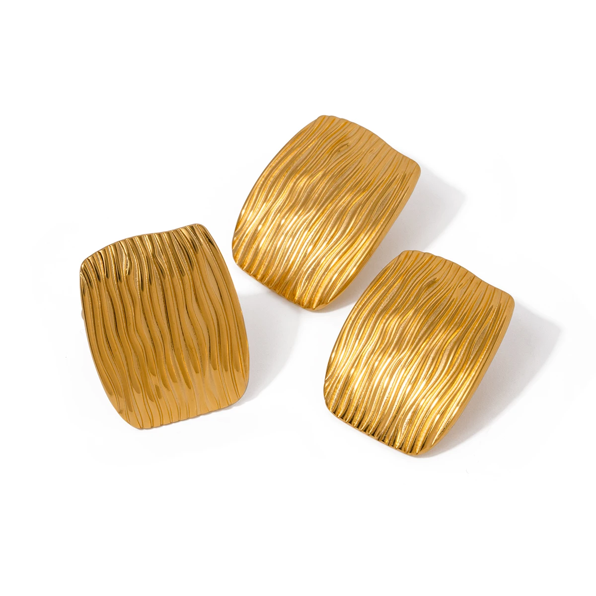 - Large rectangular geometric hoop, 15 grams, made from stainless steel with PVD gold finish, combining durability with luxurious visual appeal. It’s lightweight for constant comfort throughout the day.