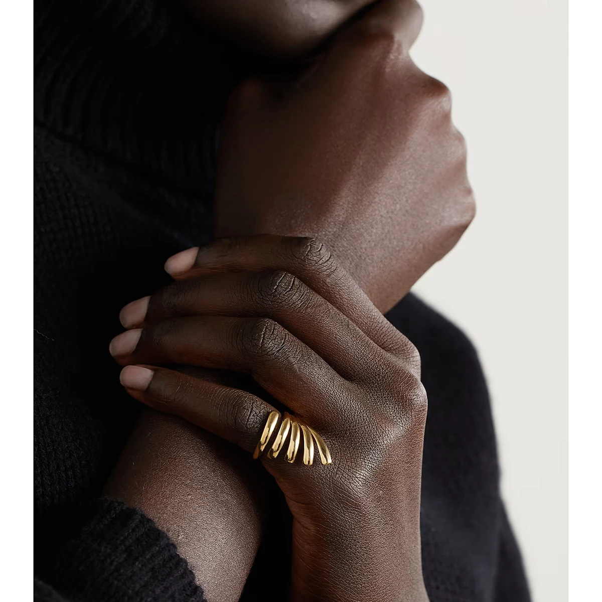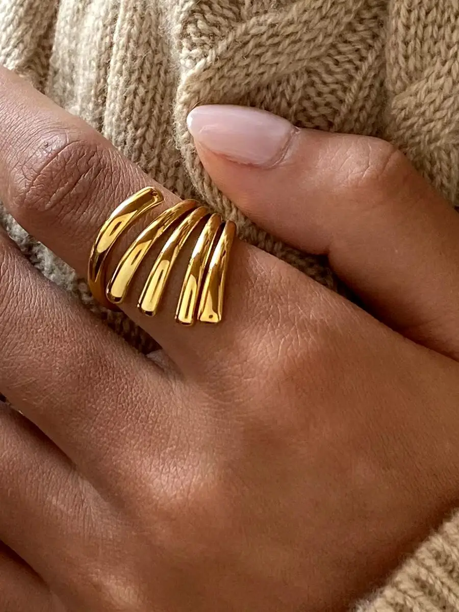 This stainless steel geometric hollow ring, weighing 15 grams, features an adjustable fit and a shiny PVD gold coating that resists fading and scratches. Crafted for durability, it is waterproof, nickel-free, lead-free, and cadmium-free, ideal for everyday wear. Its sleek, modern design showcases five interconnected, elongated, tapered bands arranged in a layered, geometric pattern, offering a minimalist yet bold aesthetic. Suitable for all sizes, this stylish accessory complements casual and contemporary outfits, adding a touch of refined sophistication. Perfect for women seeking a chic, durable piece of jewelry that combines modern design with long-lasting quality, making it an essential addition to any jewelry collection.