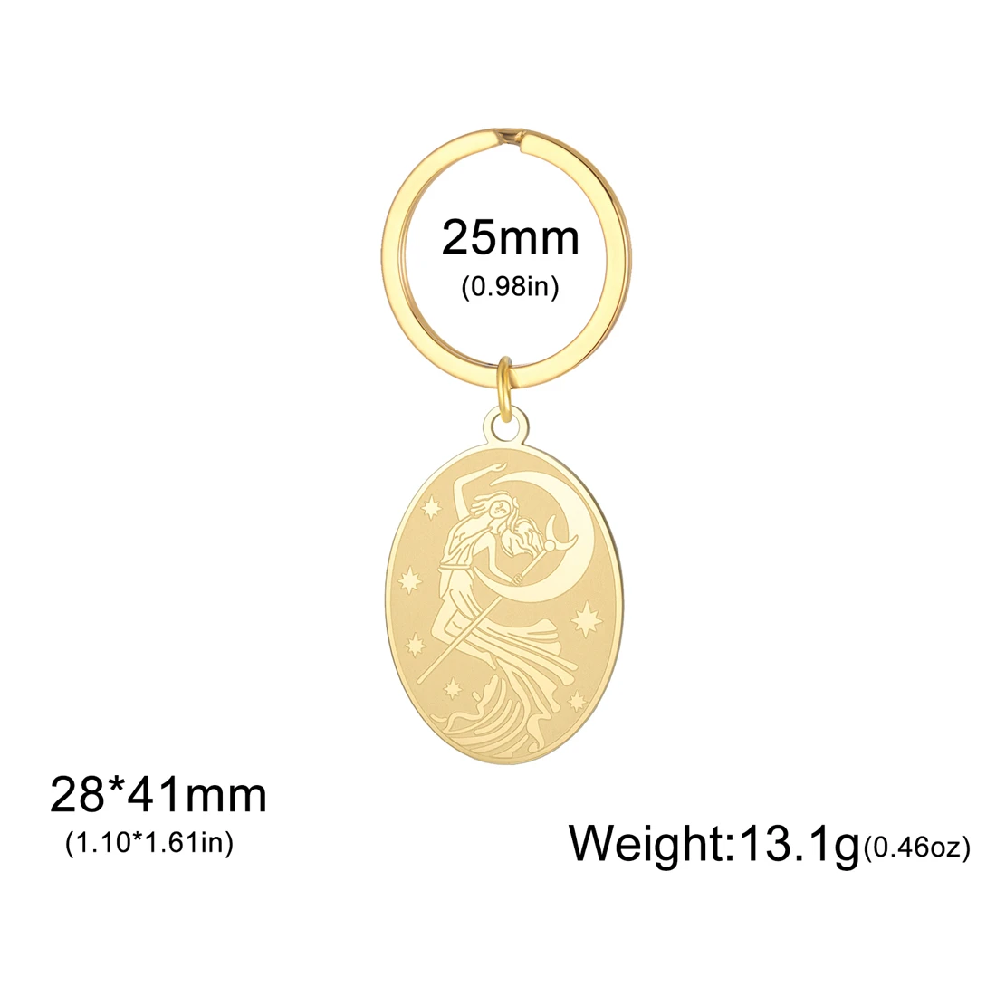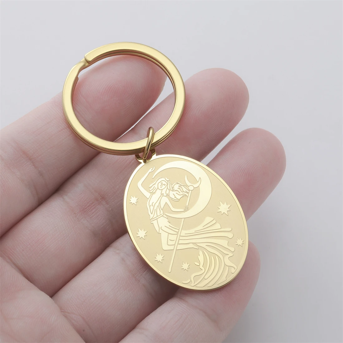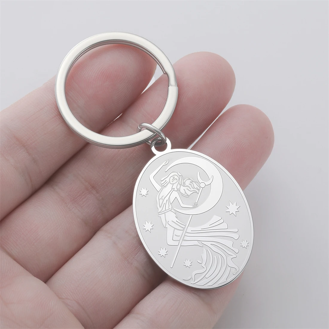 This stylish stainless steel Goddess of the Moon keychain measures 28x41mm and is available in elegant gold and silver finishes. Its oval, moon phase symbol pendant features intricate engravings depicting celestial themes, providing a minimalist yet artistic aesthetic. Crafted to resist rust, corrosion, deformation, and fading, the hypoallergenic design ensures durability and comfort. Perfect as a decorative accessory or meaningful gift for birthdays, weddings, or travel, this trendy item adds a touch of celestial allure to your everyday essentials. Its versatile design and high-quality materials make it a reliable, fashionable choice for anyone seeking both style and symbolism in their accessories.
