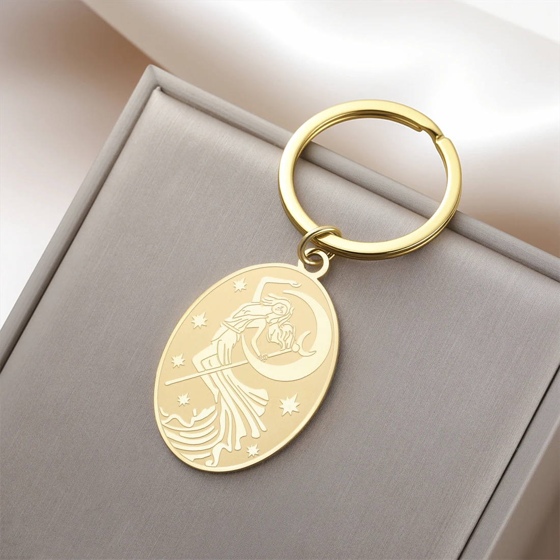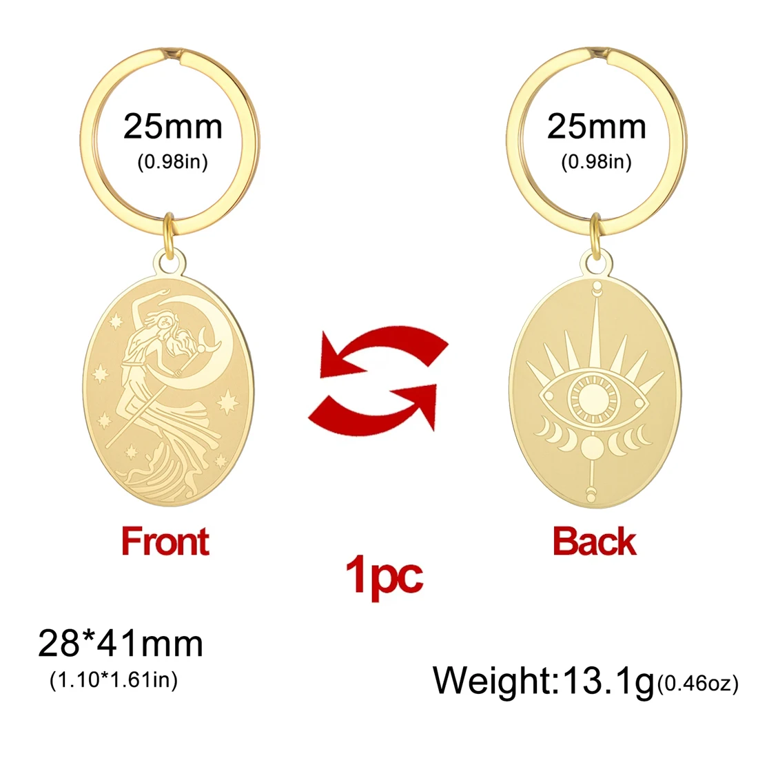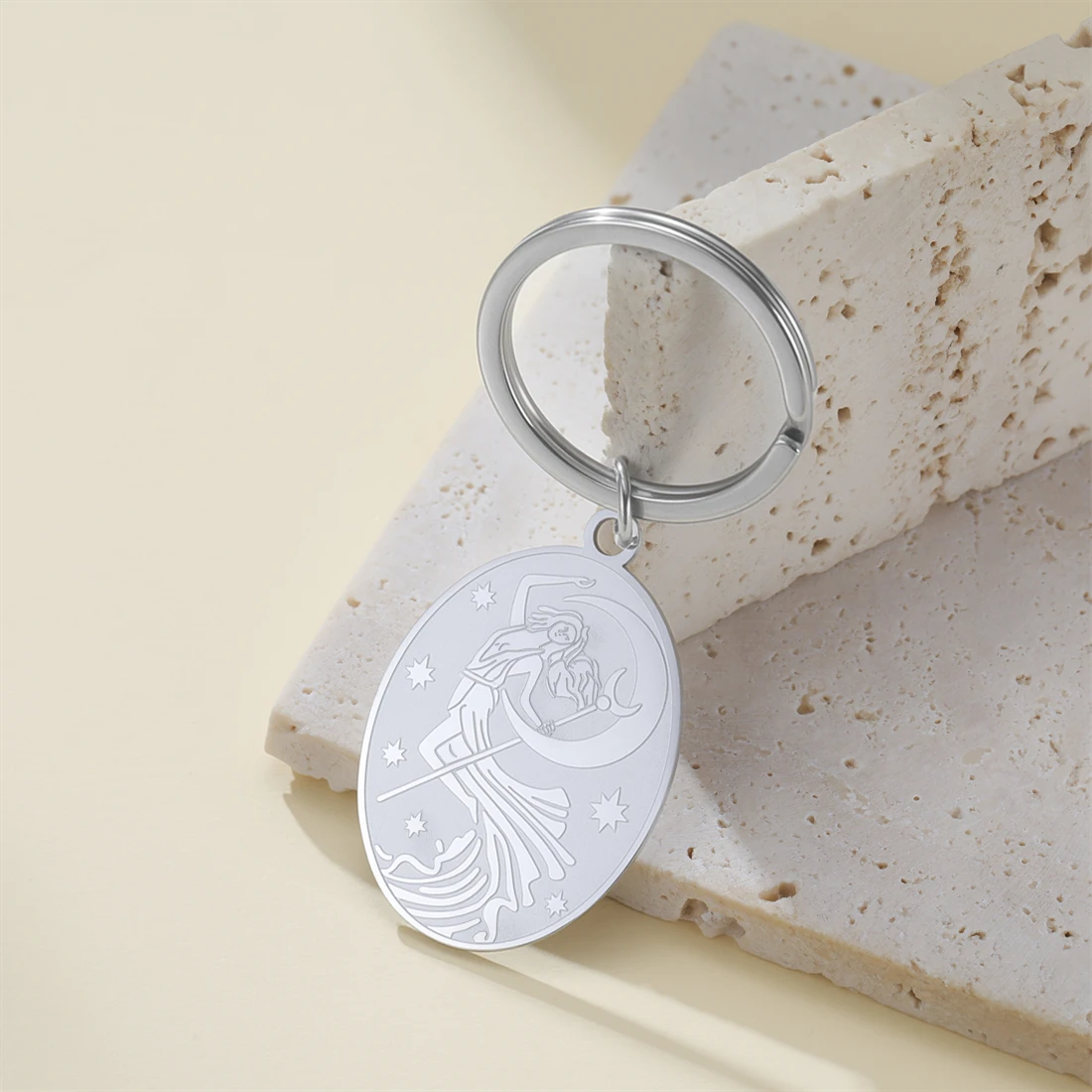 This stylish stainless steel Goddess of the Moon keychain measures 28x41mm and is available in elegant gold and silver finishes. Its oval, moon phase symbol pendant features intricate engravings depicting celestial themes, providing a minimalist yet artistic aesthetic. Crafted to resist rust, corrosion, deformation, and fading, the hypoallergenic design ensures durability and comfort. Perfect as a decorative accessory or meaningful gift for birthdays, weddings, or travel, this trendy item adds a touch of celestial allure to your everyday essentials. Its versatile design and high-quality materials make it a reliable, fashionable choice for anyone seeking both style and symbolism in their accessories.