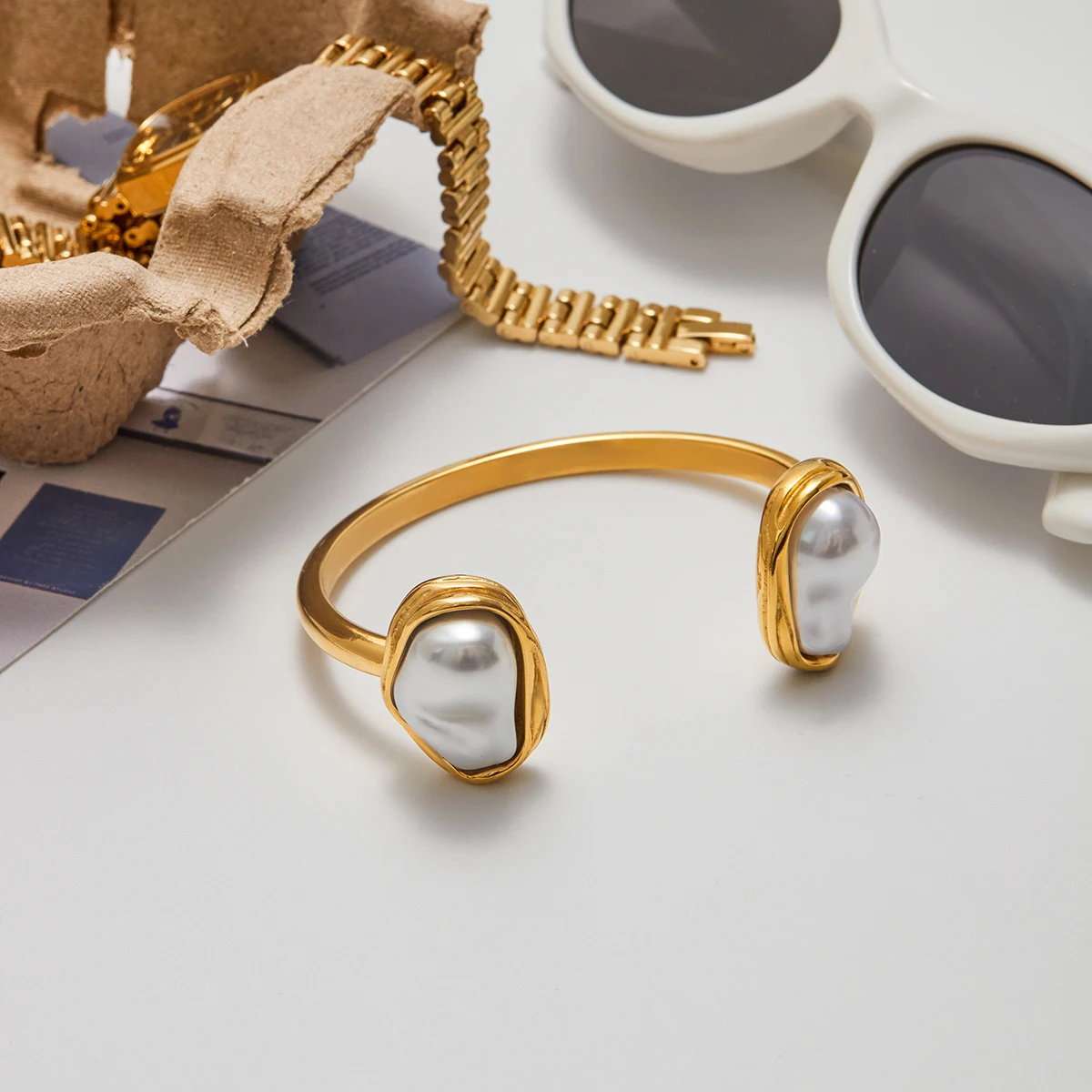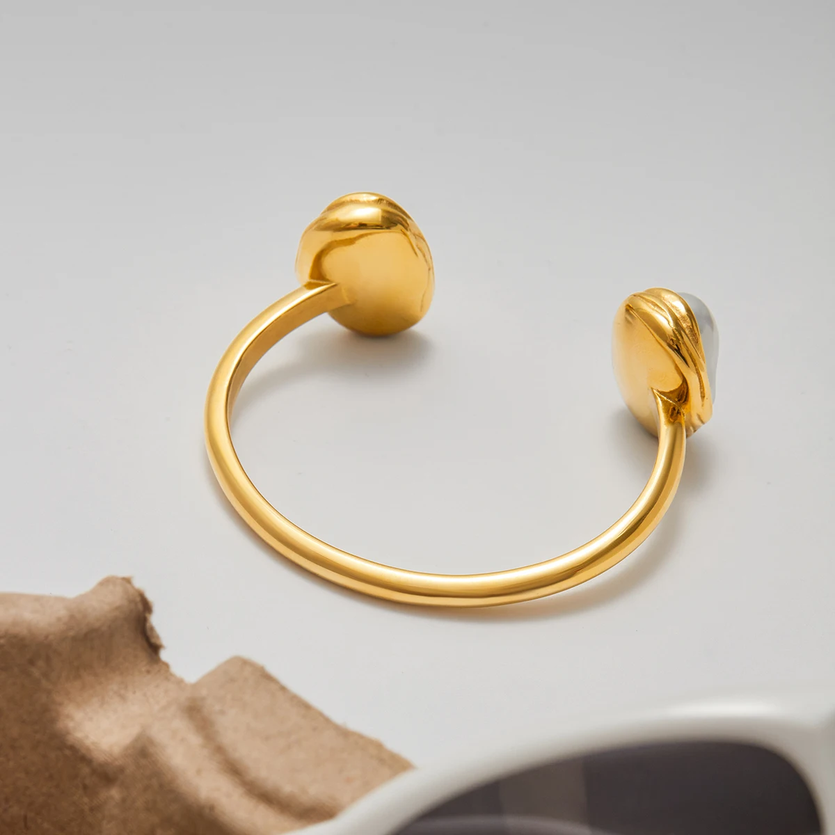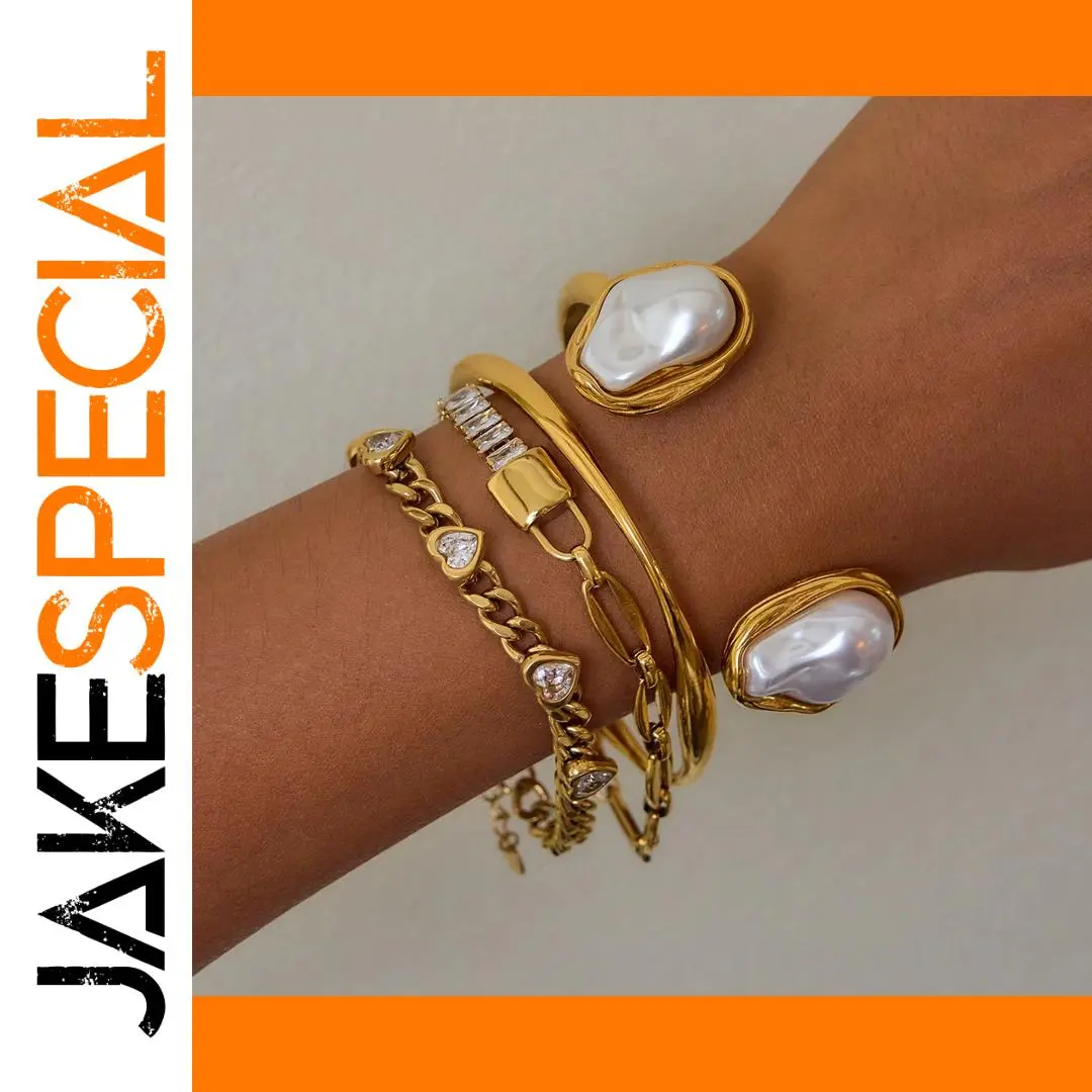 Experience the stunning blend of modern artistry and vintage charm with this stylish stainless steel bracelet in a rich platinum gold tone. The highlight is an organic-shaped resin pearl nestled within a textured, wavy gold frame that gives an artisanal, handcrafted feel. The open cuff design features bold, irregular geometric shapes, adding a contemporary edge perfect for elevating any outfit. Accompanying this piece are delicate chain-style bracelets with tiny crystal-embellished heart charms and sleek rectangular gold plates, creating a versatile and layered jewelry set. Crafted from durable stainless steel, it offers a luxurious appearance with shiny, reflective finishes, making it a must-have for fashion-forward women seeking a unique, elegant accessory.