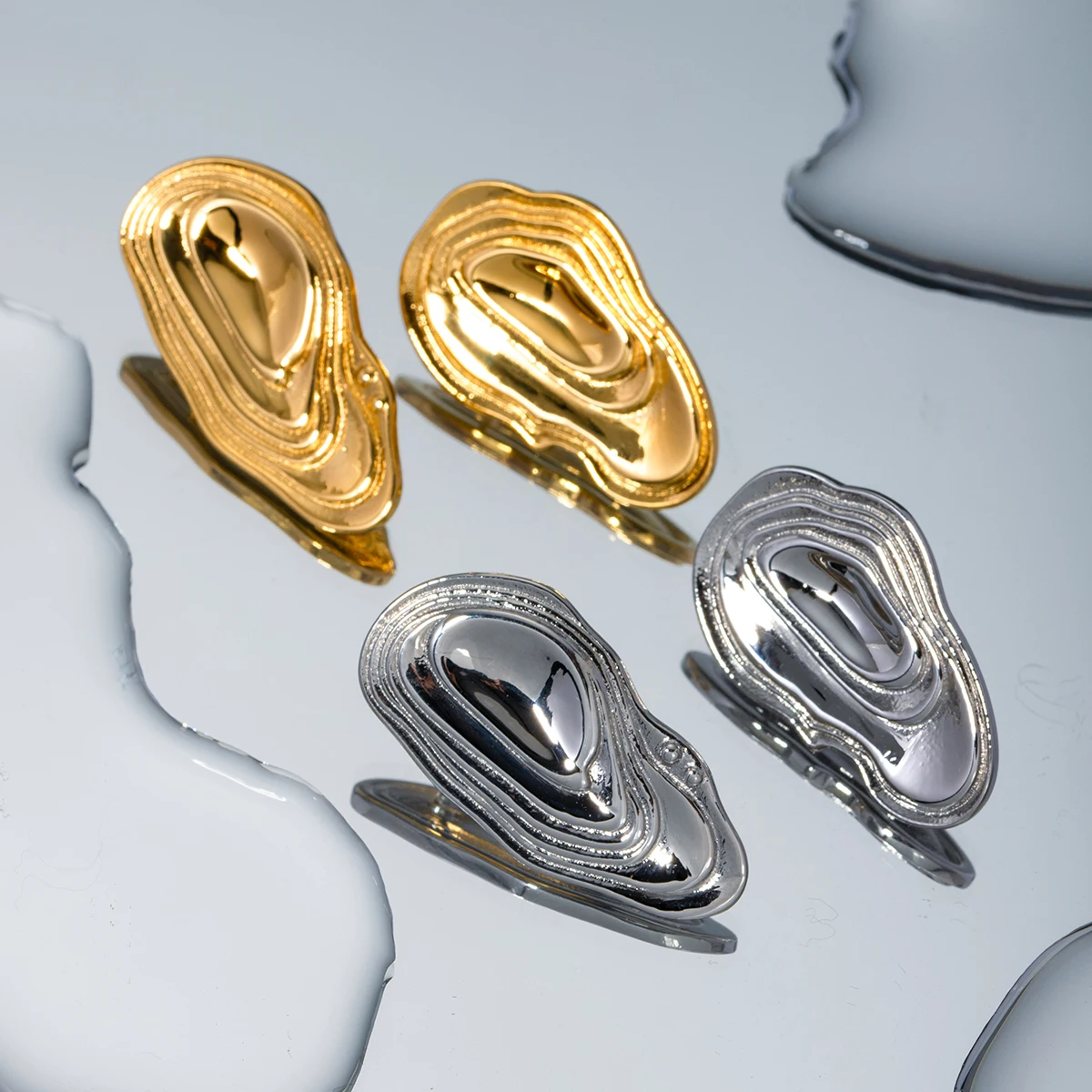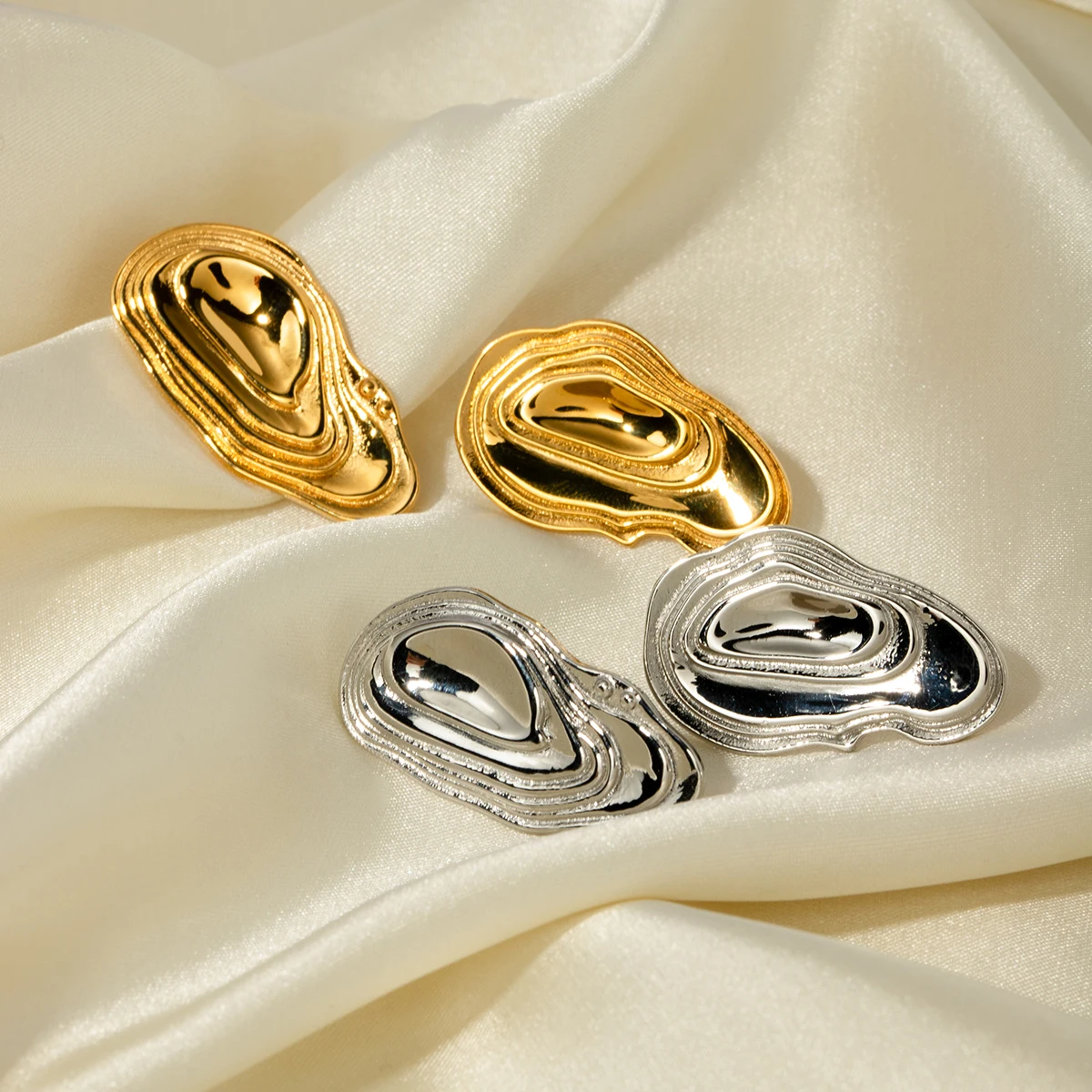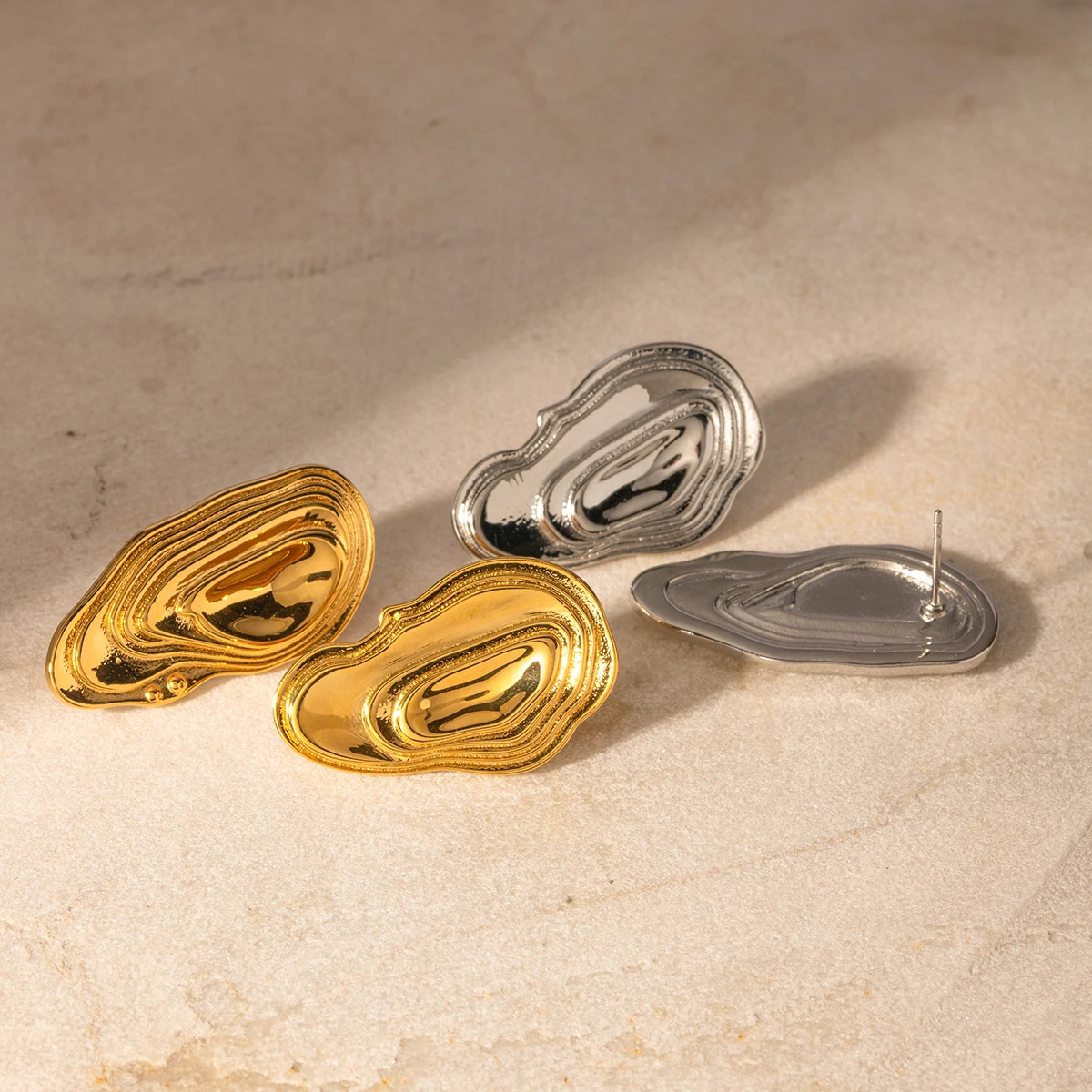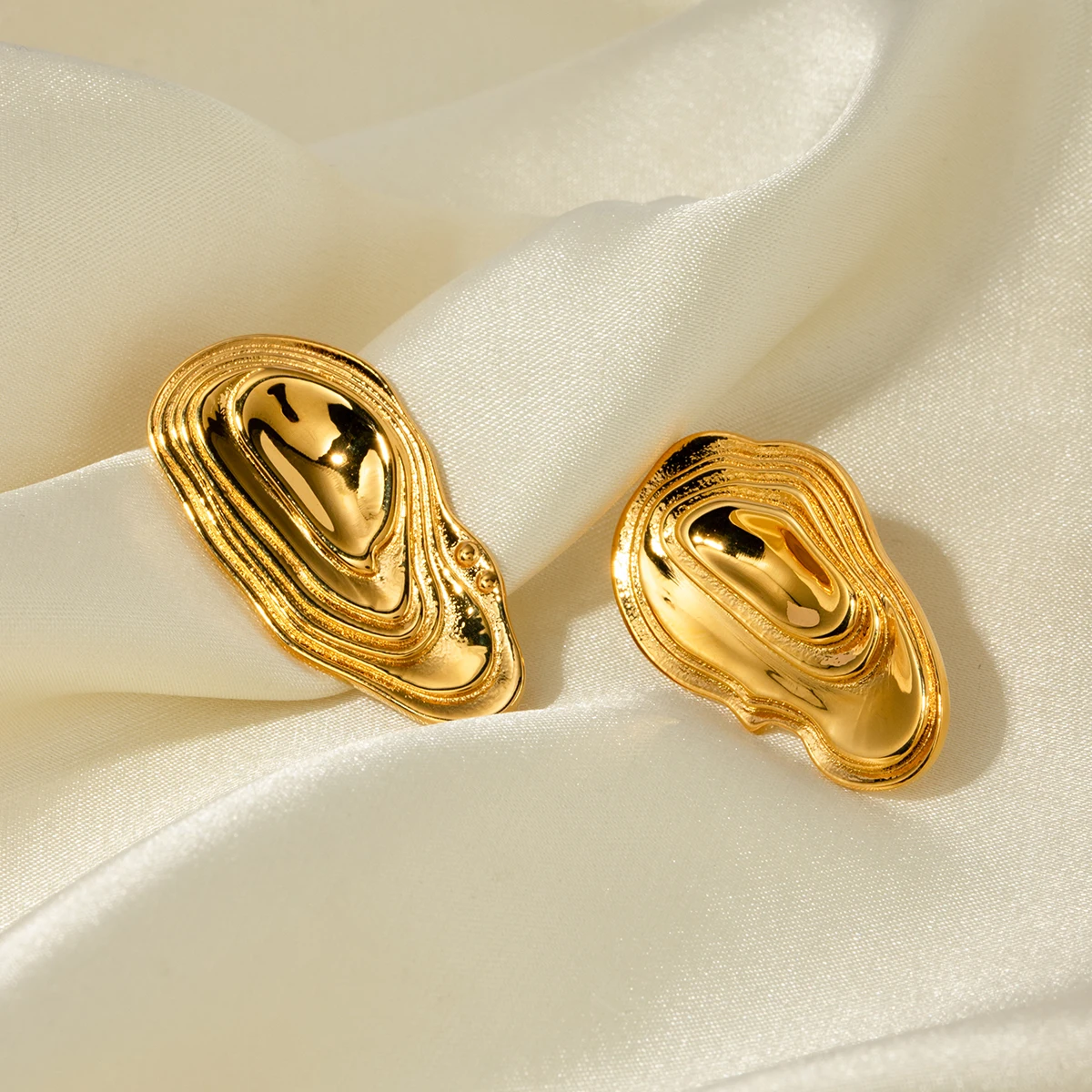 Step into sophistication with this pair of uneven stainless steel stud earrings that effortlessly combine modern artistry with timeless elegance. Crafted from durable stainless steel with a PVD gold coating, these earrings boast a luminous, polished surface that reflects light beautifully. Their unique, irregular swirl shape offers an abstract, artistic flair, perfect for women who appreciate minimalist yet distinctive jewelry. The vintage gold and subtle silver tones blend seamlessly to give a versatile, chic look suitable for any occasion. At approximately 15 grams, they feel substantial yet comfortable, making them an ideal choice for daily wear or special events. The waterproof construction and scratch-resistant finish ensure long-lasting beauty, so you can enjoy their stylish design for years to come.