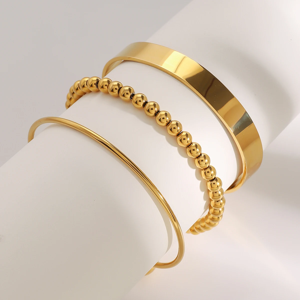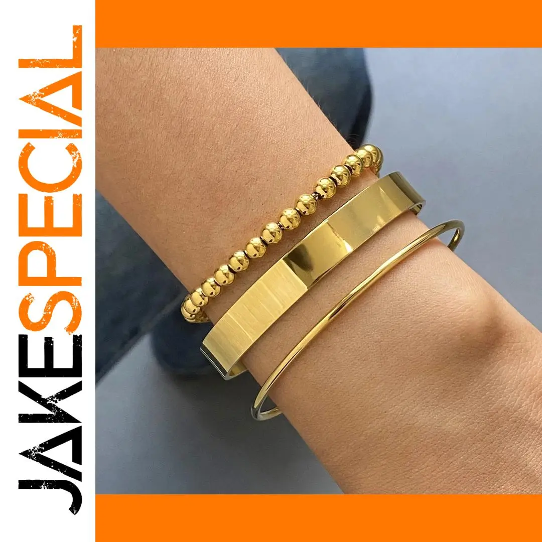 Experience the perfect blend of elegance and modernity with this fashionable women's wide face bracelet. Crafted from durable stainless steel with a PVD gold finish, it boasts a long-lasting, shiny, polished surface that resists fading and scratches. The bracelet features a stunning bead stack design on a sleek, smooth bangle, giving it a chic and sophisticated appearance. Its versatile style complements both casual and formal outfits, making it an ideal accessory for any occasion. Weighing just 15 grams and completely waterproof, this bracelet combines practical durability with fashionable appeal. Whether you’re gifting someone special or treating yourself, this piece embodies quality and trendy design, enhancing your everyday look effortlessly.