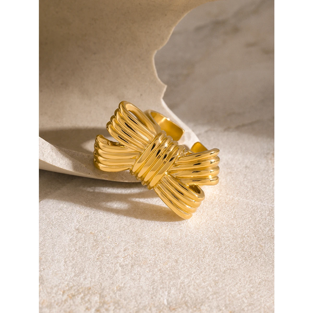 Imagine elevating your style with this eye-catching gold bow-knot ring, crafted from durable stainless steel and coated with a long-lasting PVD gold finish. Its bold design features smooth, rounded bands forming a chic bow shape, perfect for making a fashionable statement at parties or special occasions. The highly polished, reflective surface enhances the luxurious, warm gold hue, radiating elegance and sophistication. The open tension mount style ensures a comfortable fit on various finger sizes, adding a modern edge to timeless beauty. Light yet sturdy at approximately 9 grams, this jewelry piece combines functionality with fabulous aesthetics. Its waterproof, nickel-free material makes it ideal for daily wear, ensuring enduring shine and style.