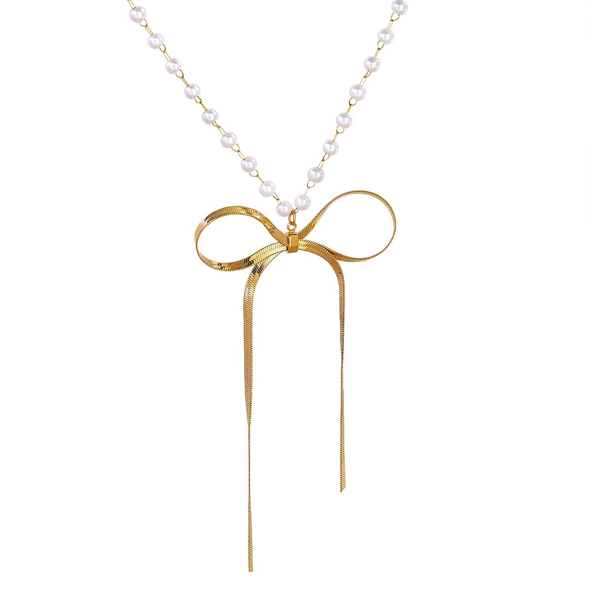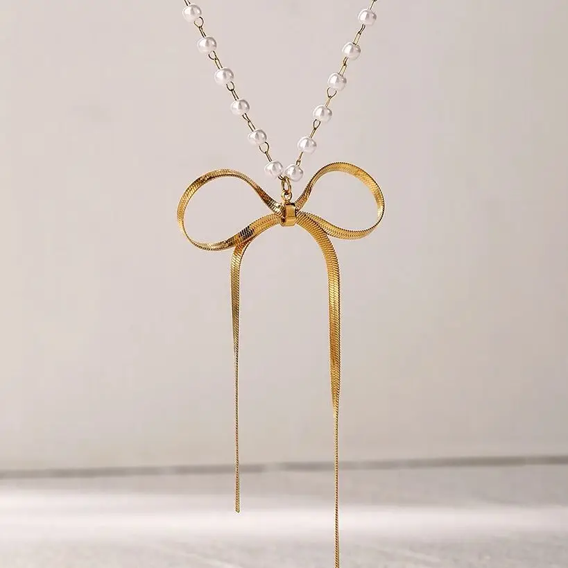 - The bowknot pendant is textured with a shiny gold finish, complemented by two elegant chain tassels, adding a romantic and trendy aesthetic.