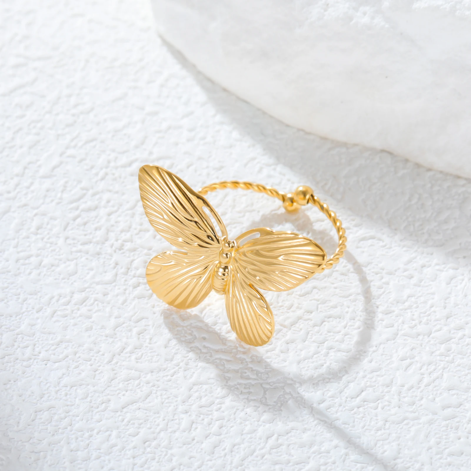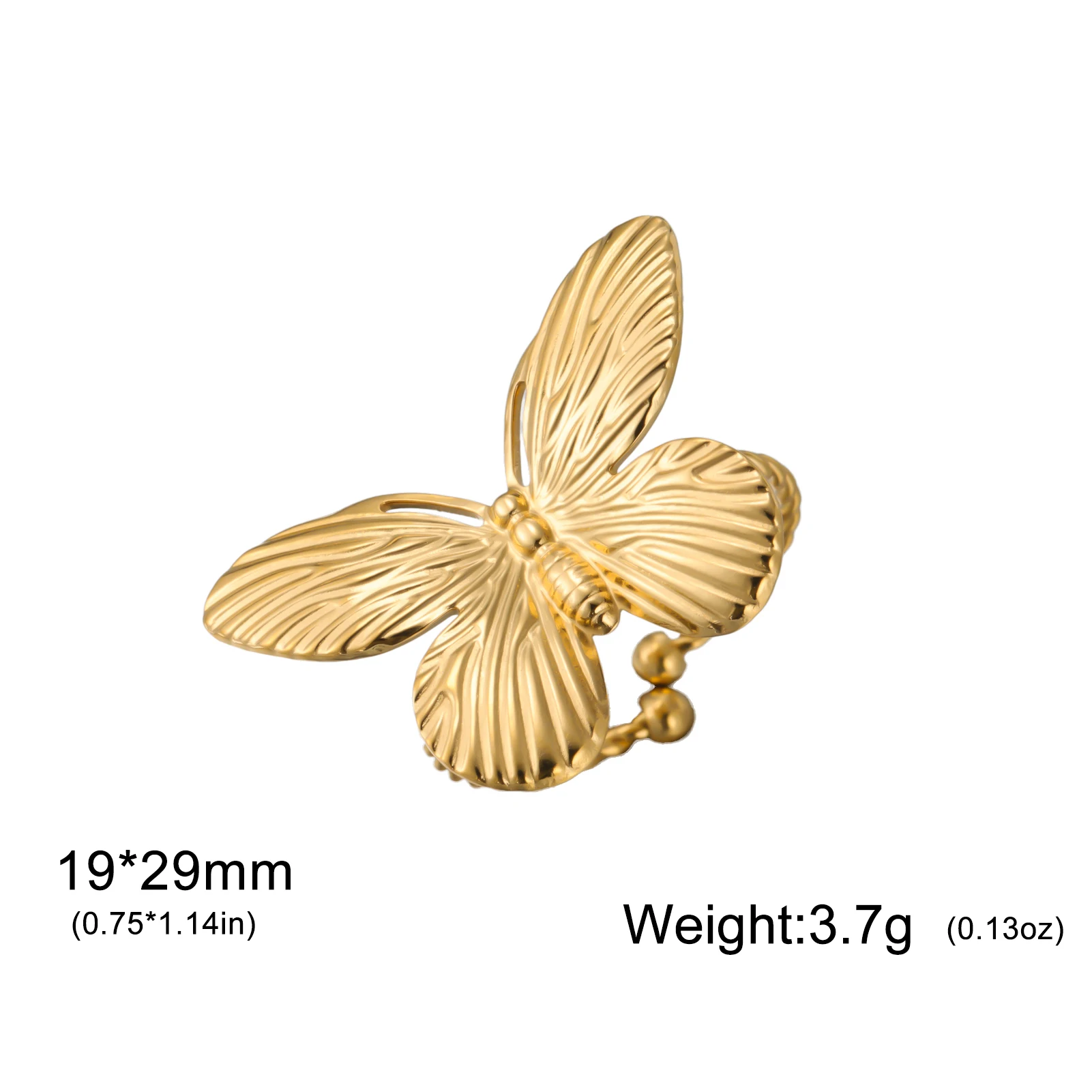 Step into a world of refined fashion with this stunning butterfly ring. Crafted from durable stainless steel and finished with 18k gold vacuum plating, this ring exudes elegance and sophistication. Its intricate design features textured, ribbed wings that resemble a delicate butterfly in mid-flight, adding a touch of nature-inspired beauty to your everyday style. The open, resizable band ensures a comfortable fit for various finger sizes, making it perfect for daily wear. Whether you're dressing up for a special occasion or adding a fashionable accent to your casual look, this ring promises versatility and charm. Its shiny finish and detailed craftsmanship showcase a blend of trendiness and elegance, making it an ideal gift for yourself or cherished loved ones.