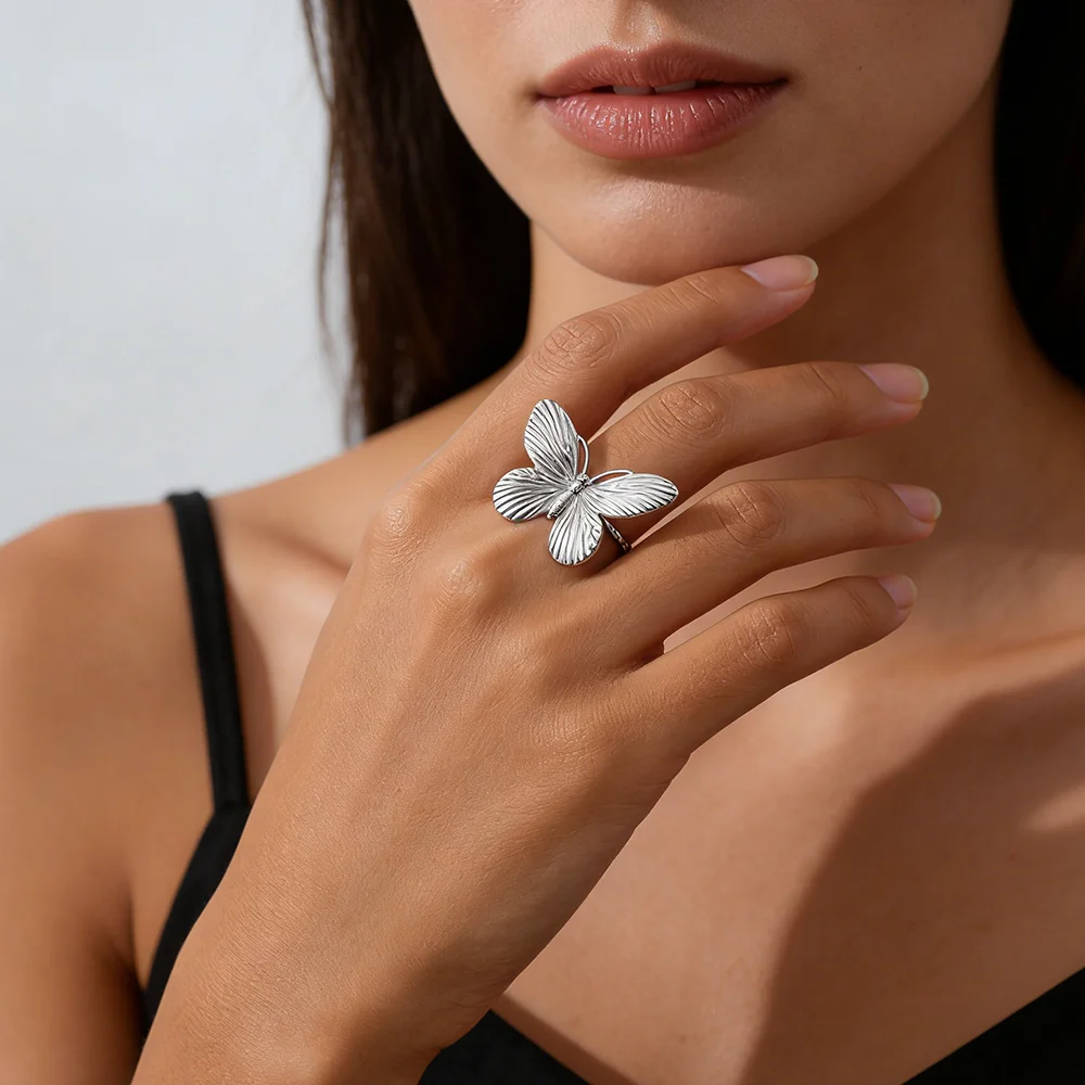 This beautiful butterfly ring is more than just jewelry; it's a statement of elegance and personality. Imagine the compliments you'll receive as you wear this eye-catching accessory, elevating any look effortlessly. Whether as a gift or a personal treat, this versatile piece fits perfectly into your collection. Its durable stainless steel construction ensures it will remain stunning over time, while its stylish design makes it suitable for any occasion. Don't wait—add a touch of nature-inspired glamour and trendiness to your jewelry collection today. Experience the luxury and craftsmanship firsthand with this exquisite butterfly ring.