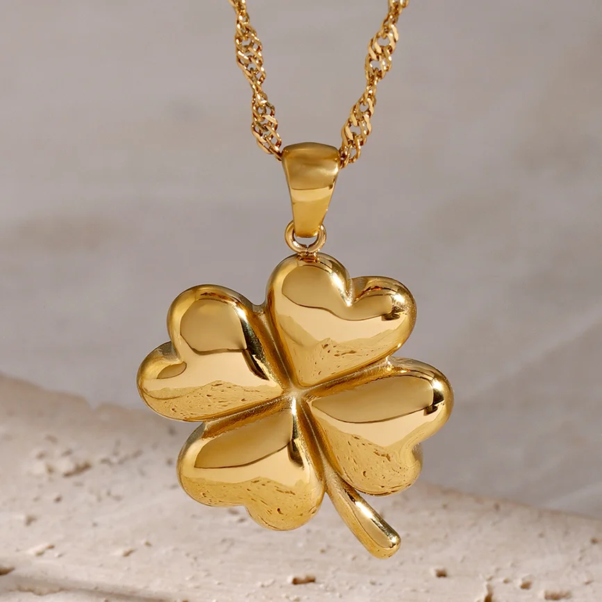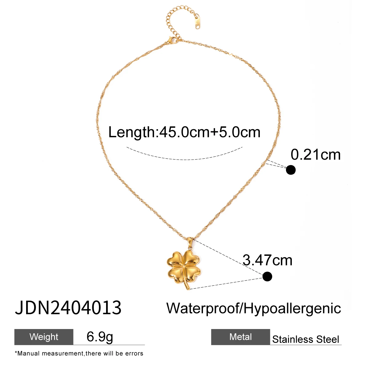 Enhance your jewelry collection with this stylish stainless steel necklace featuring a gold-colored PVD finish that resists fading and scratching, ensuring long-lasting elegance. Weighing approximately 15 grams, the pendant showcases a geometric, four-leaf clover-inspired design with a polished, reflective surface and lush, contoured leaves that add a touch of natural sophistication. The twisted rope chain perfectly complements the pendant’s warm gold hue, creating a versatile accessory suitable for both casual and formal occasions. Waterproof and free of nickel, lead, and cadmium, this trendy and durable piece is designed for women who appreciate contemporary yet timeless jewelry, making it ideal for parties, special events, or everyday wear.