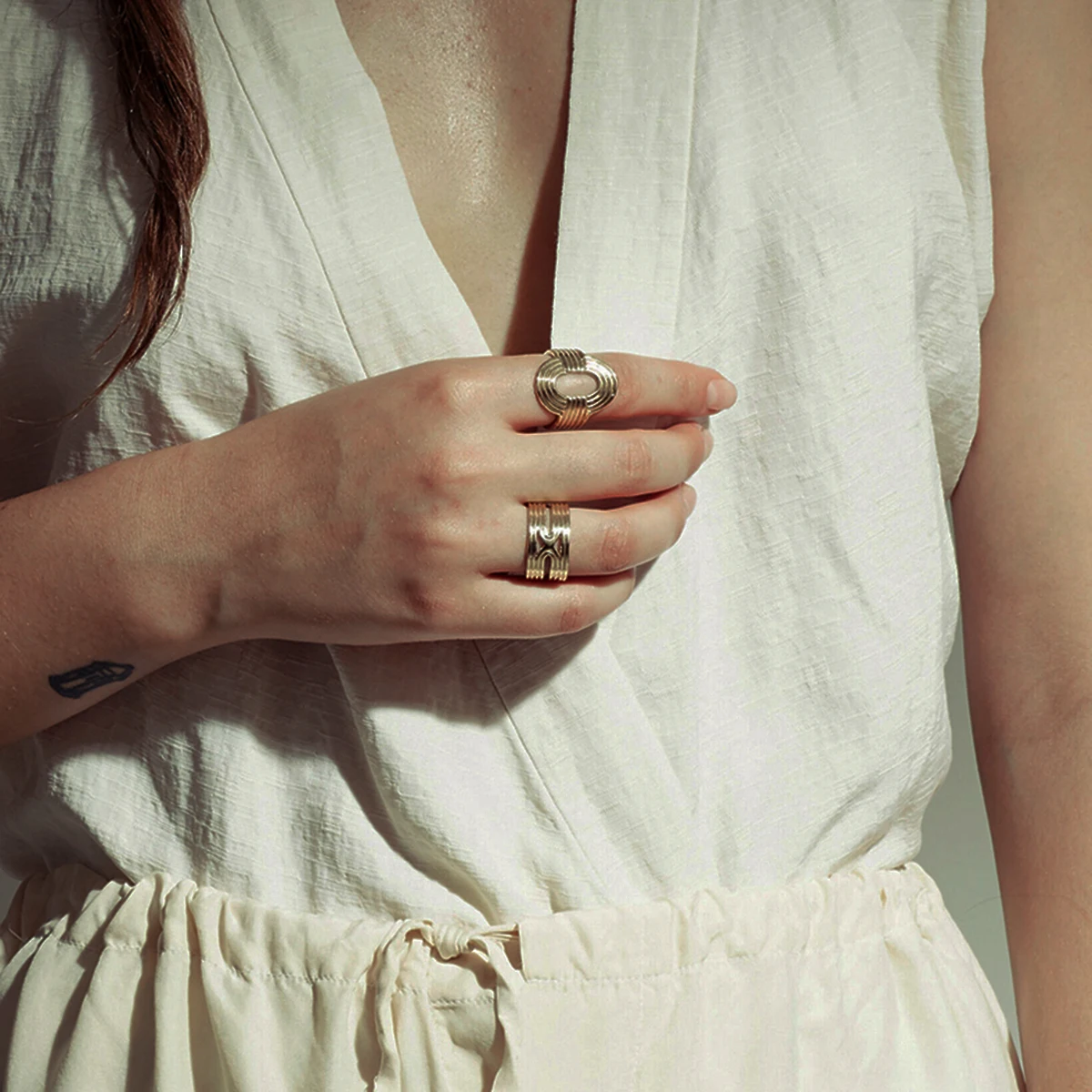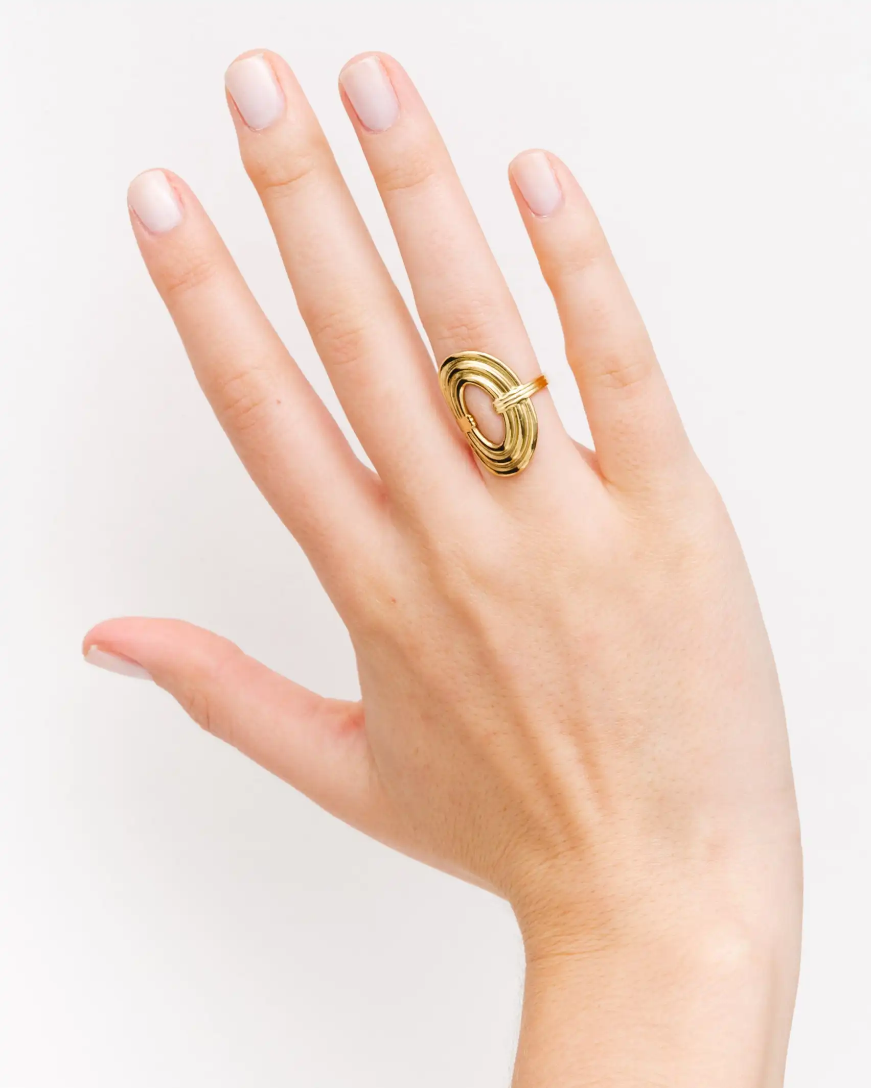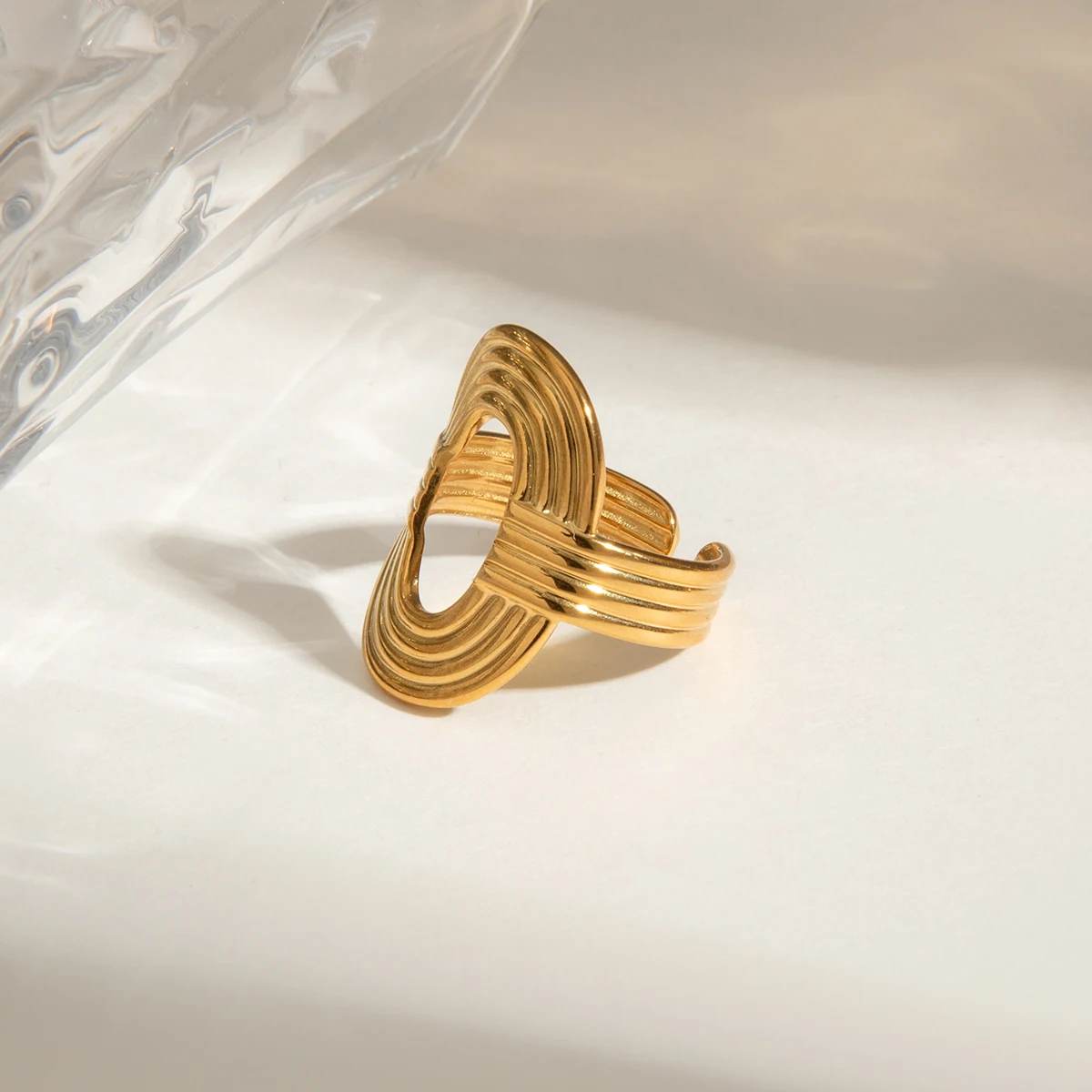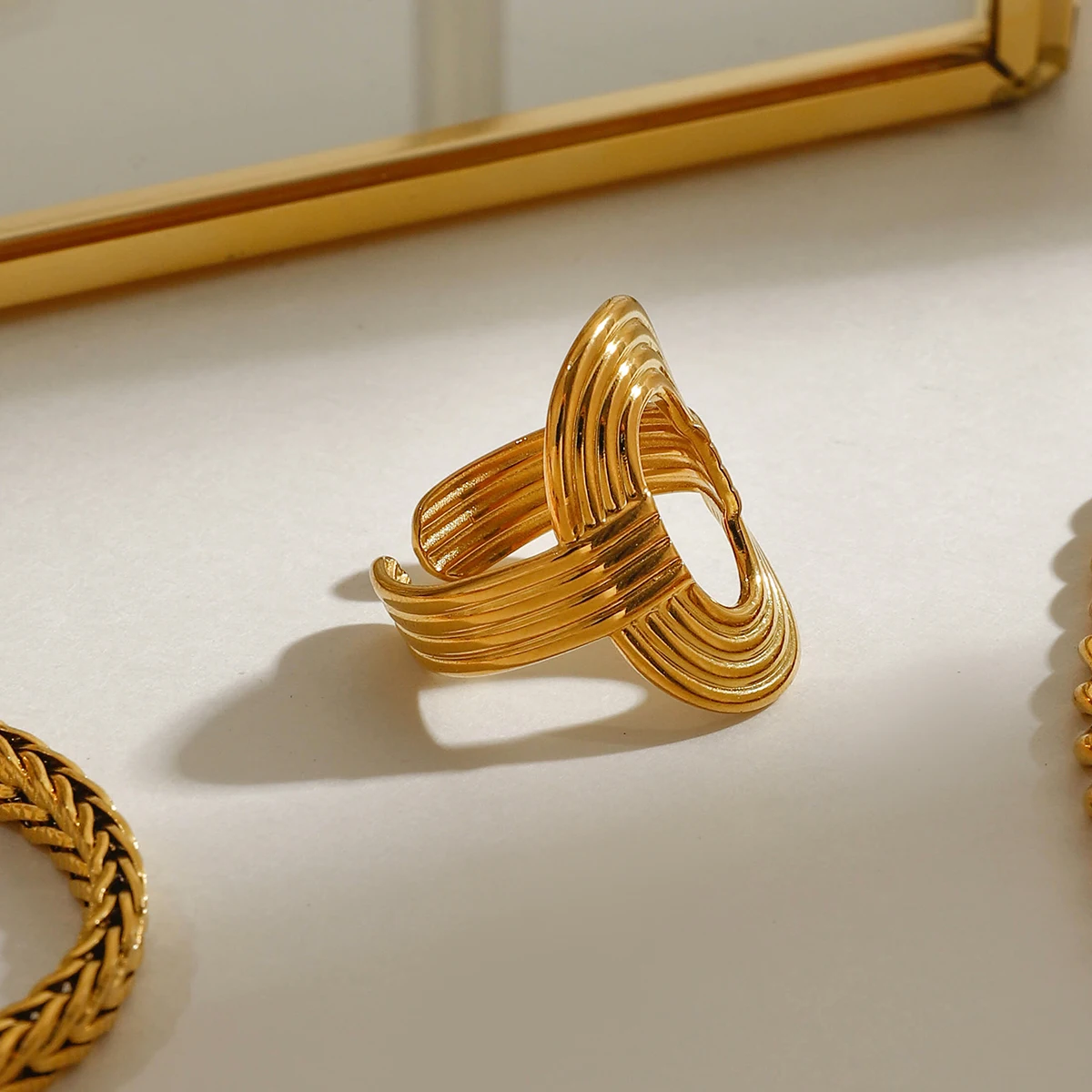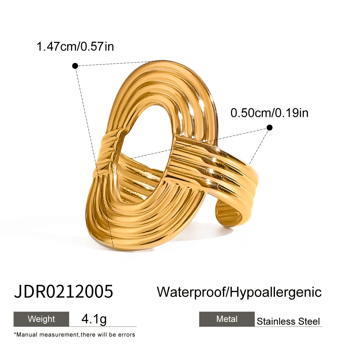 - Fashionable minimalist design with layered concentric ridges enhances visual appeal. Crafted from stainless steel with PVD gold, it ensures long-lasting color and resistance to scratches or fading.