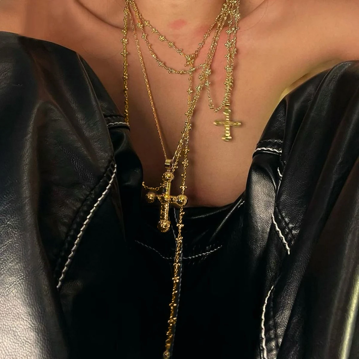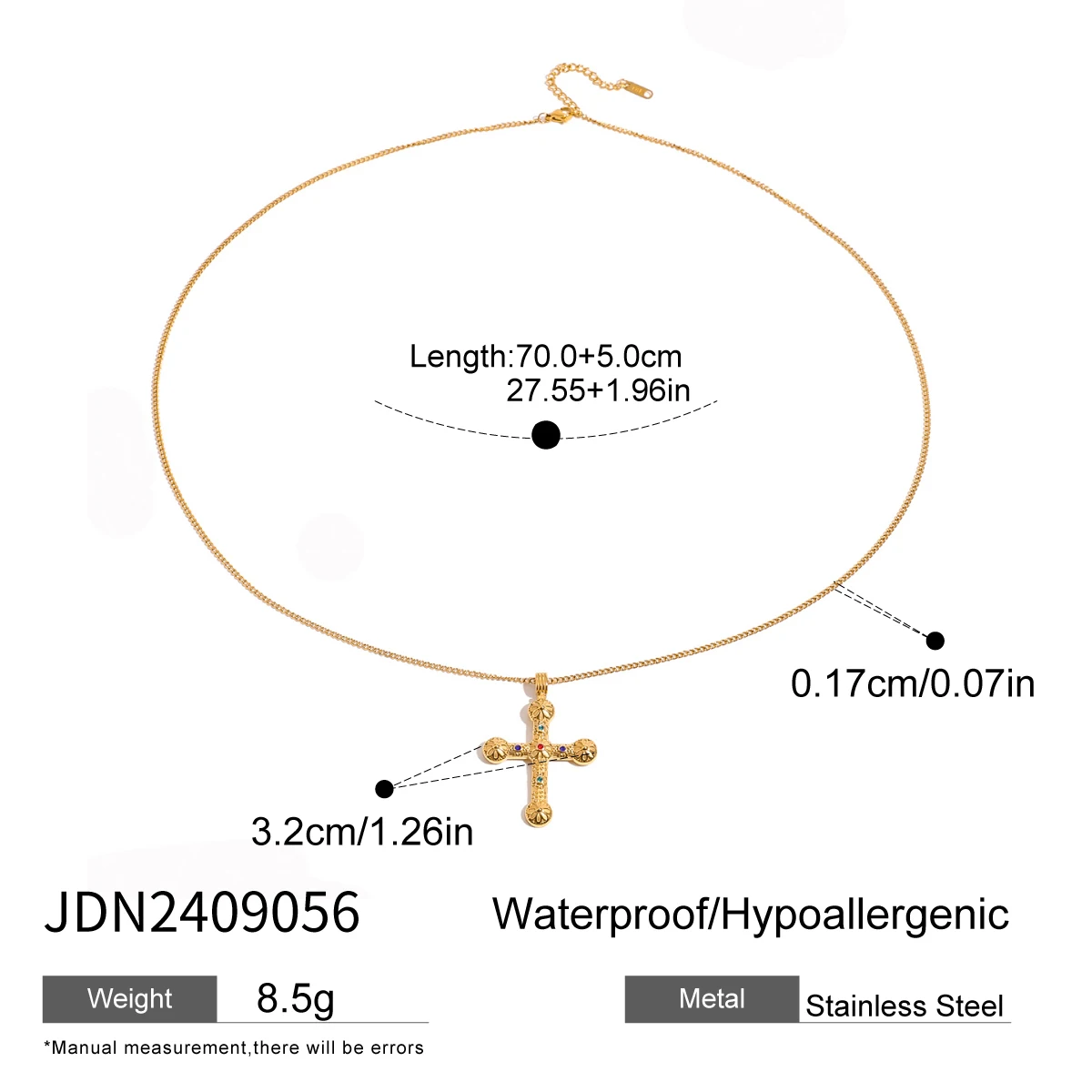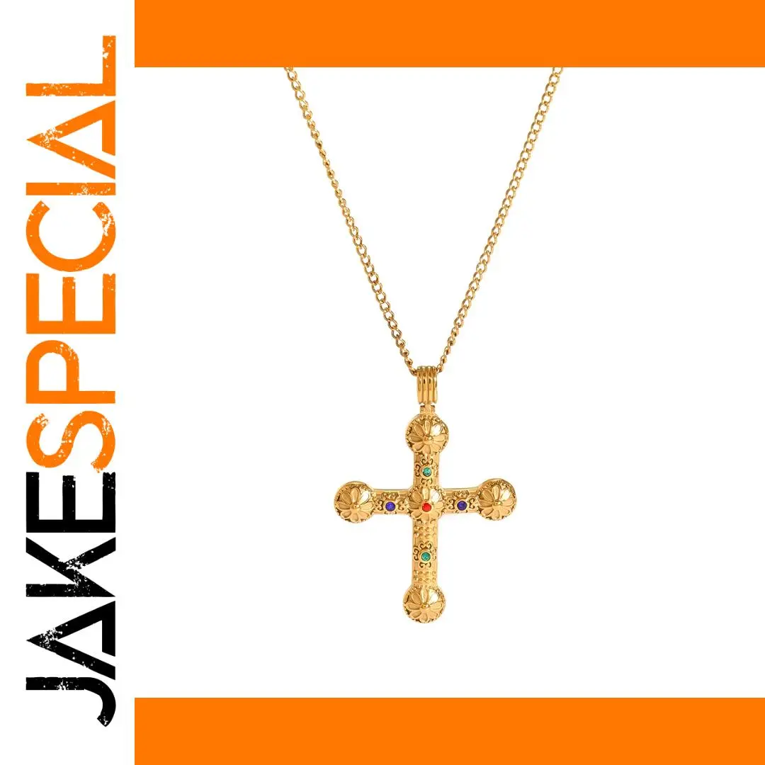 Imagine elevating your style with this stunning gold-tone necklace featuring a detailed cross pendant. Crafted from durable stainless steel, it offers a polished finish that resists tarnishing and maintains its luxurious shine over time. The cross is decorated with ornate floral engravings at each end, showcasing refined artistry. Brightly colored zircon stones—red, blue, green, and purple—are symmetrically embedded within the pendant, adding lively vibrancy. The delicate oval-link chain complements the pendant’s artistic design with its smooth, flowing appearance. Perfect for both casual and formal looks, this versatile piece makes a bold statement while remaining elegant. Wear it confidently knowing you’re showcasing a beautiful, durable accessory designed to last.