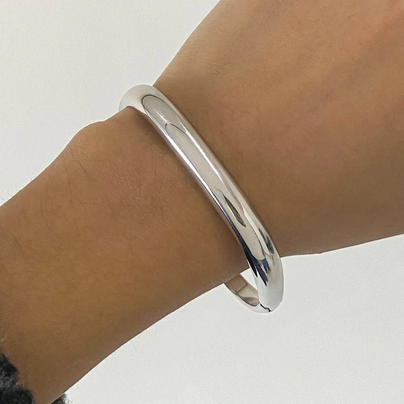 - The classic round shape and cuff style provide easy wearability without any visible clasps or hinges, creating a seamless, sophisticated profile.