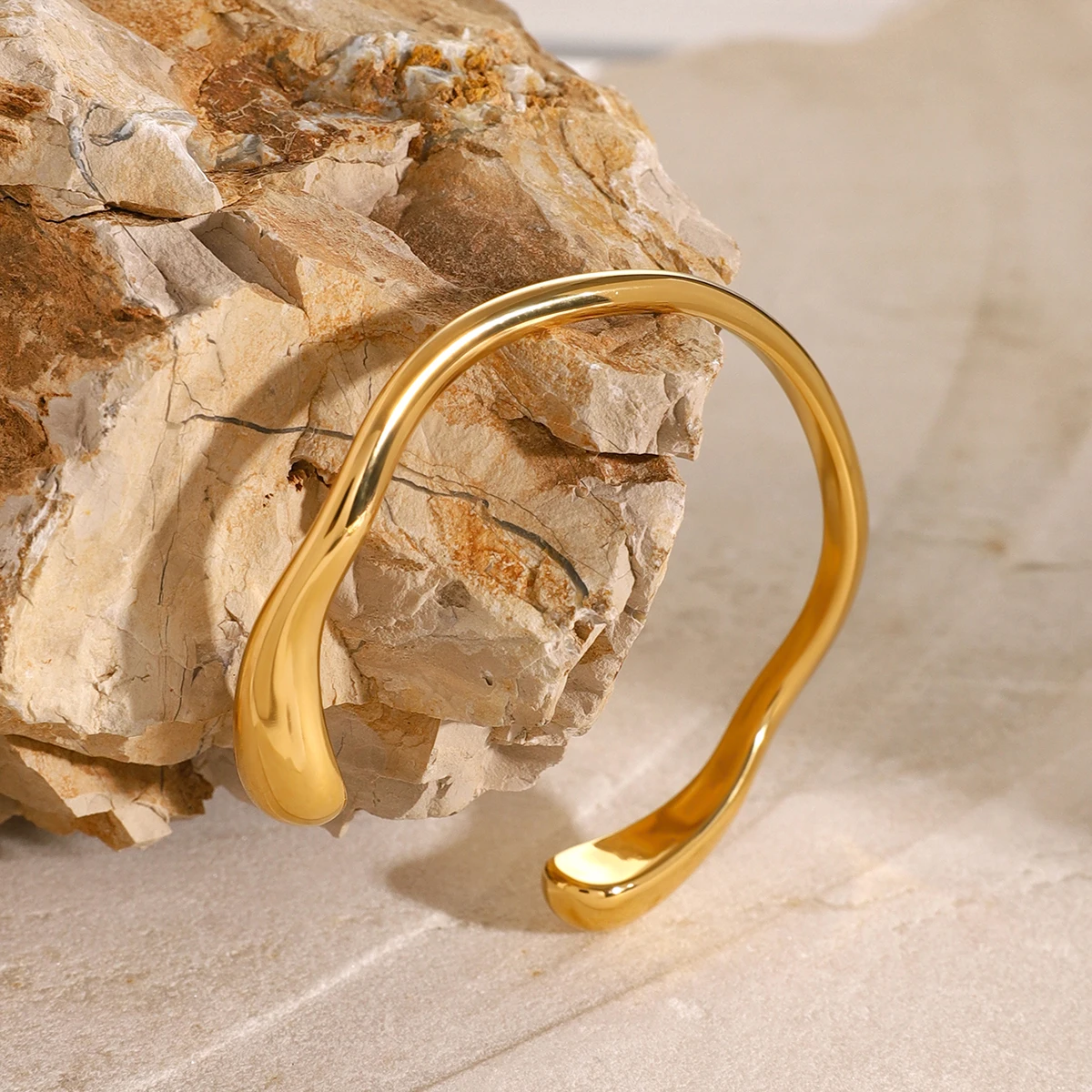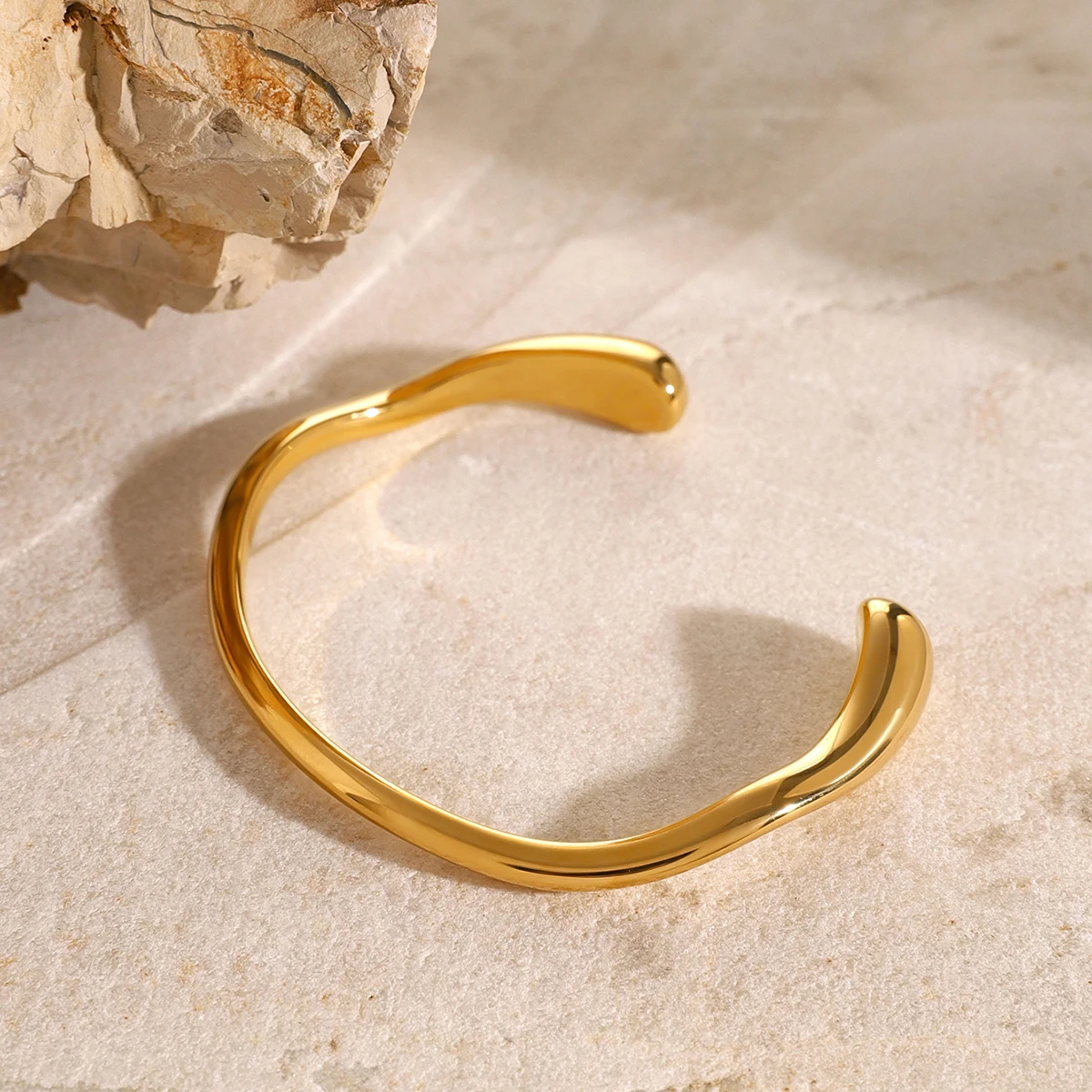 Experience effortless elegance with this modern stainless steel cuff bracelet, designed for women who appreciate minimalist luxury. Its open-ended, flexible design makes it easy to slip on and adjust to your wrist smoothly. Crafted from high-quality stainless steel coated in shiny gold, it radiates sophistication and durability. The irregular textured surface adds a trendy, contemporary touch, ensuring it stands out whether you’re heading to a casual outing or a formal event. Rounded, smooth ends provide comfort and prevent sharp edges, making it suitable for all-day wear. The slightly curved shape wraps beautifully around your wrist, enhancing your everyday style with a fashionable yet practical accessory. Elevate your wardrobe effortlessly with this versatile bracelet.