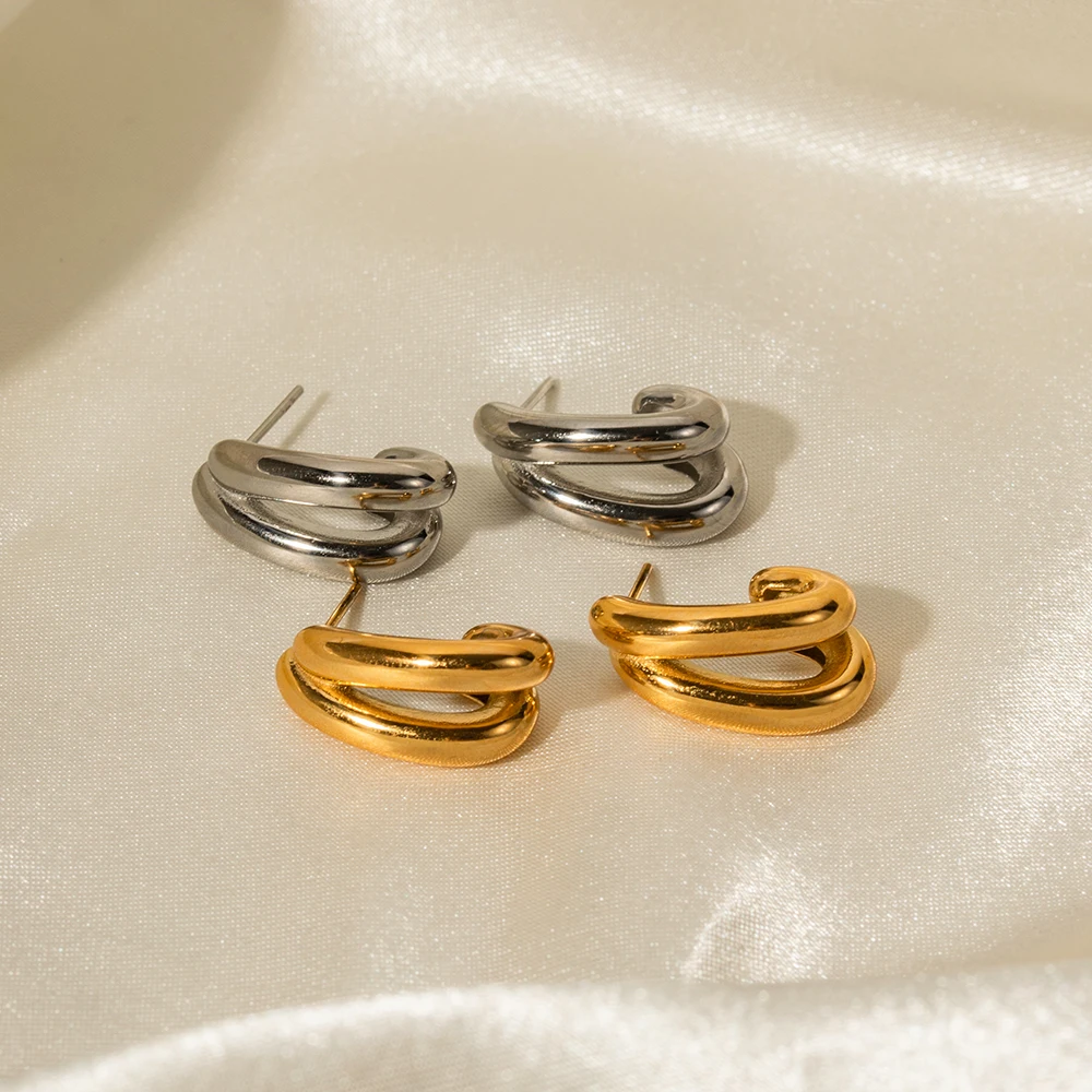 Enhance your everyday style with these stainless steel double-layer gold C-shaped earrings, featuring a sleek, modern design with a polished, high-shine finish. Crafted for durability and elegance, they showcase a geometric hollow double-layer structure that adds depth and contemporary flair. Available in model variants JDE2304027 and JDE2304027-S, these waterproof earrings are secured with push-back findings, ensuring easy and comfortable wear. Their bold, minimalist aesthetic makes them versatile enough for both casual and formal occasions, elevating your look effortlessly. Experience sophisticated simplicity with these stylish, high-quality accessories designed to complement any outfit with refined modernity.