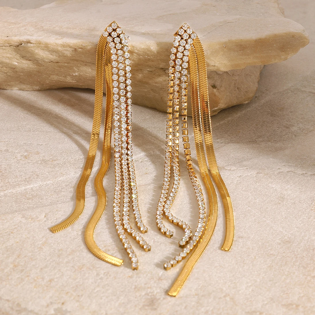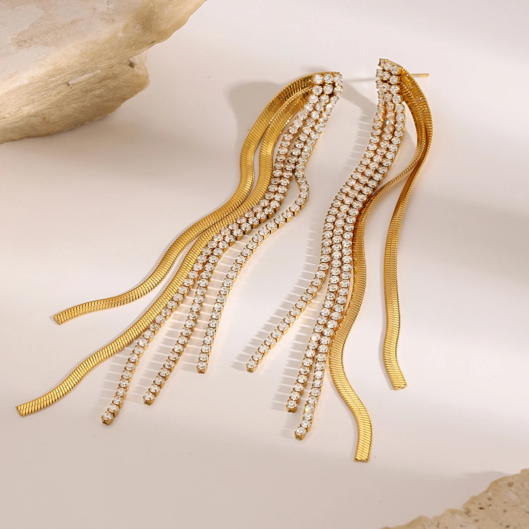 Elevate your style with these modern stainless steel drop earrings featuring a PVD gold finish for long-lasting color, durability, and resistance to scratches or fading. Highlighting a trendy triangle design, each earring is waterproof, nickel, lead, and cadmium-free, ensuring comfort and safety. Weighing 13.9 grams, the earrings showcase a layered, glamorous look with textured, vertically grooved gold-tone strips hanging from sparkling triangular accents. Perfect for making a statement at any formal or fashionable occasion, these earrings combine boldness, elegance, and high-quality craftsmanship, embodying a sophisticated yet trendy aesthetic for women.