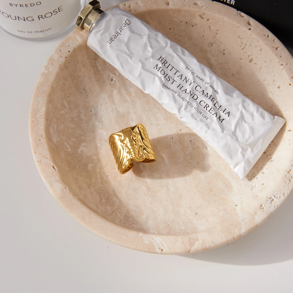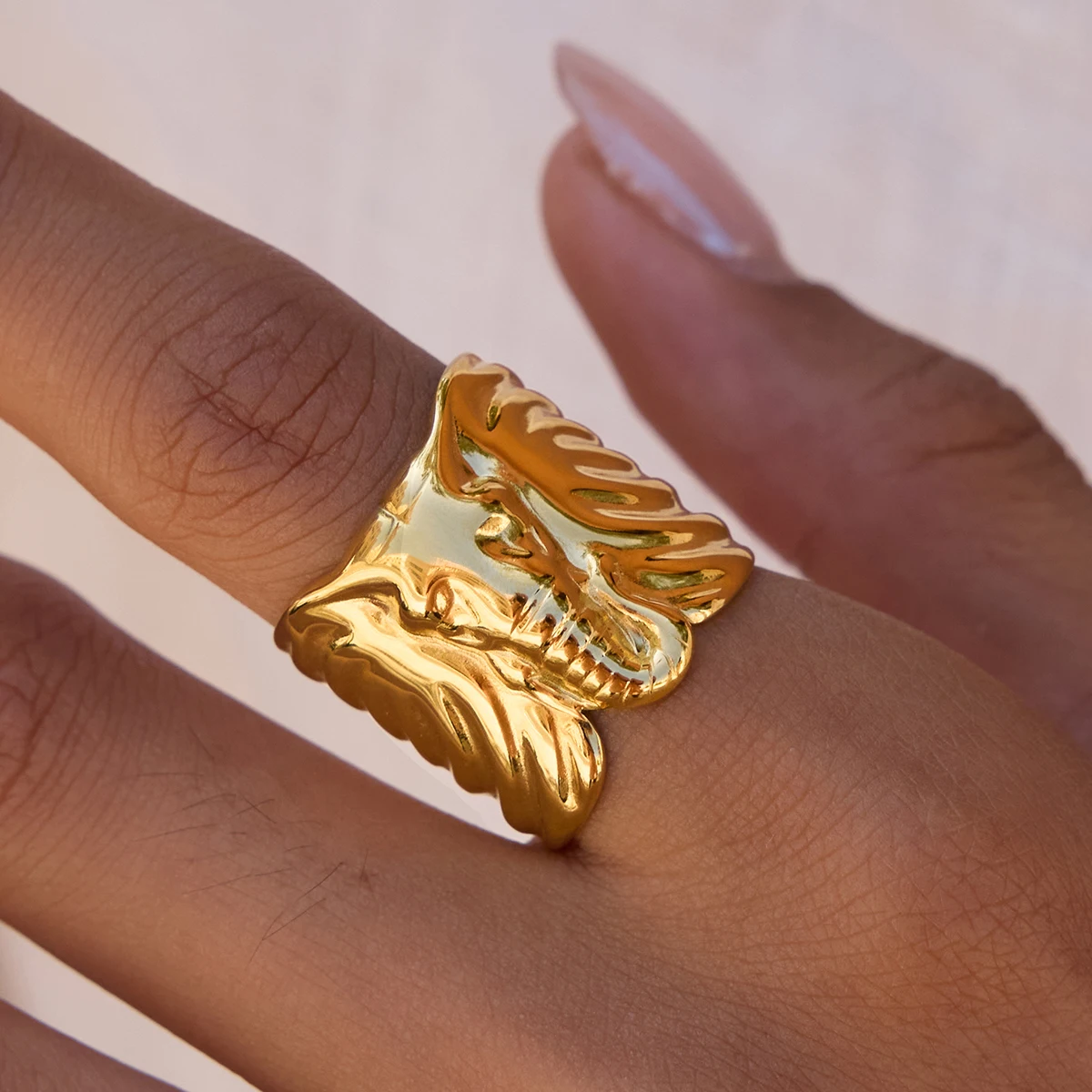 This minimalist wide face elephant open ring, crafted from stainless steel with a striking gold finish, features a 2mm wide surface and an abstract elephant motif with a prominent trunk and textured details. Designed for women, its sleek, polished look offers a trendy, fashion-forward appeal suitable for parties and casual occasions. The open style with a slight front gap provides a comfortable fit, making it compatible with other jewelry pieces for versatile styling. Perfect for those seeking a modern, artistic accessory, this stylish ring combines bold design with durable materials, enhancing your unique fashion statement effortlessly.