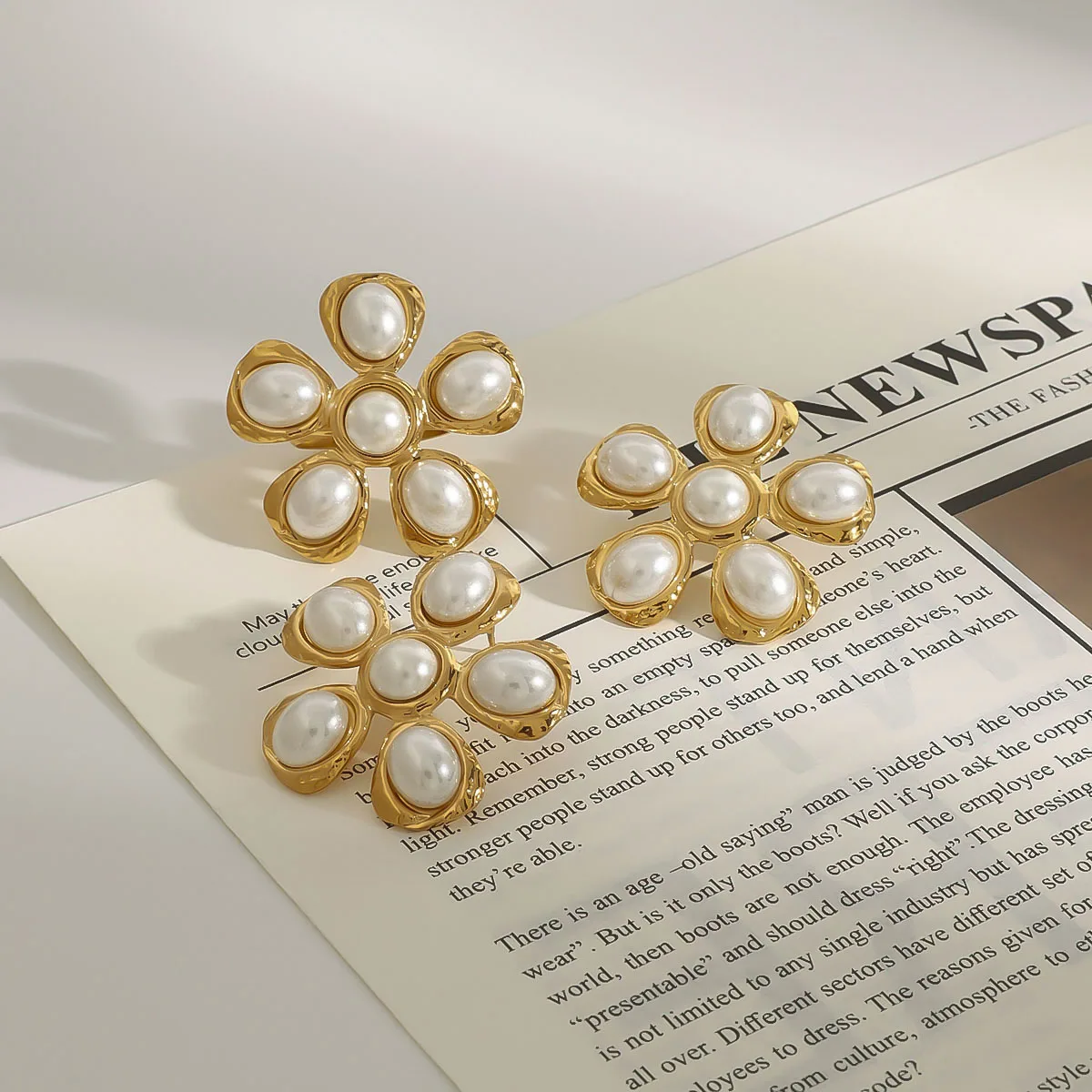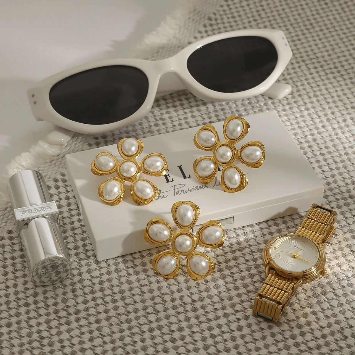 - Adorned with large white pearls forming the petals, creating a striking contrast against the gold finish for a sophisticated look.