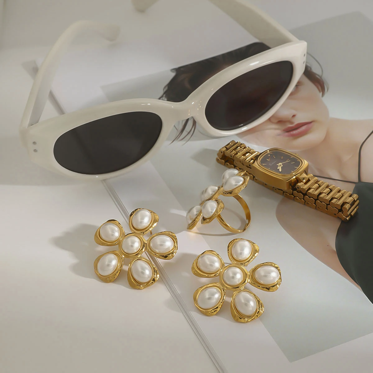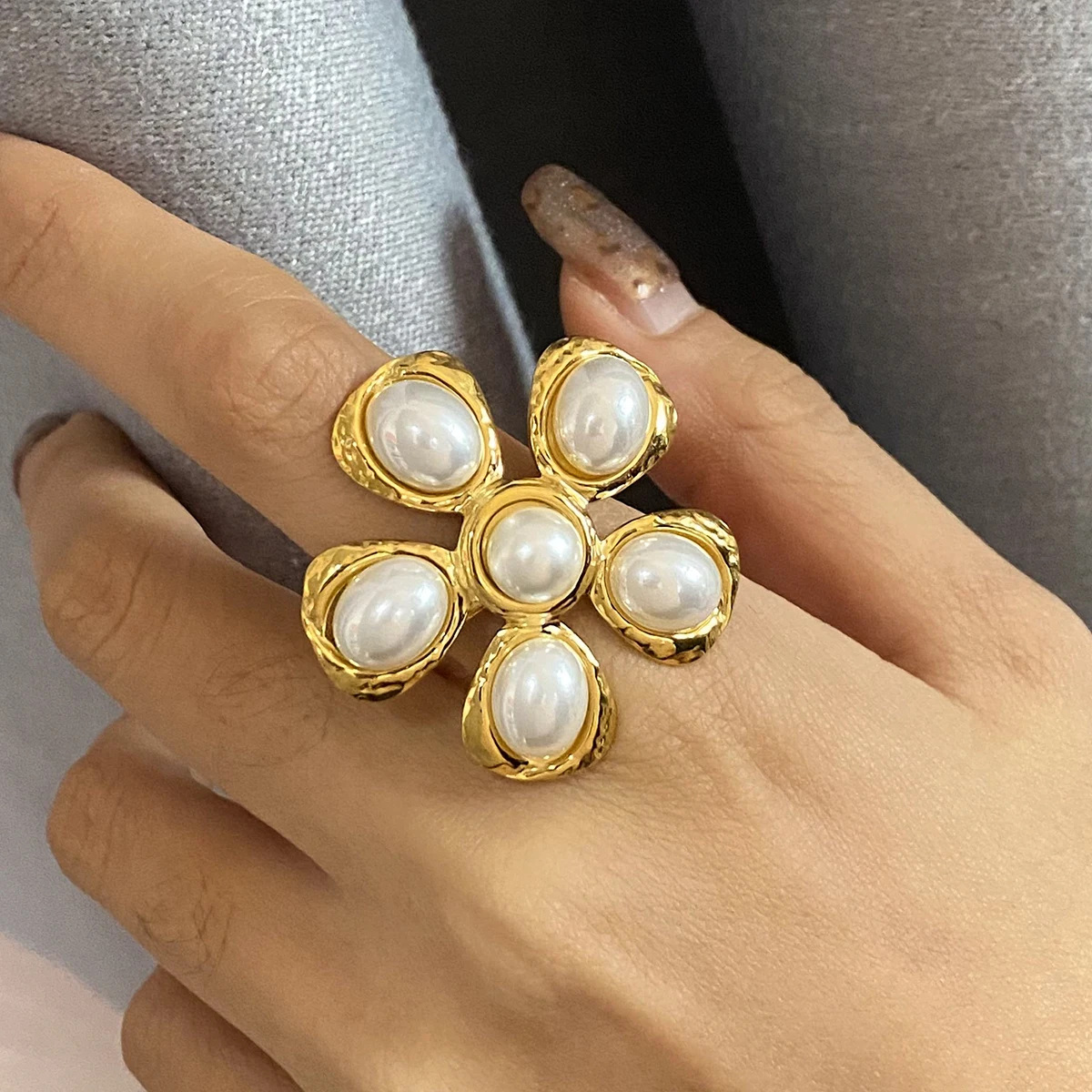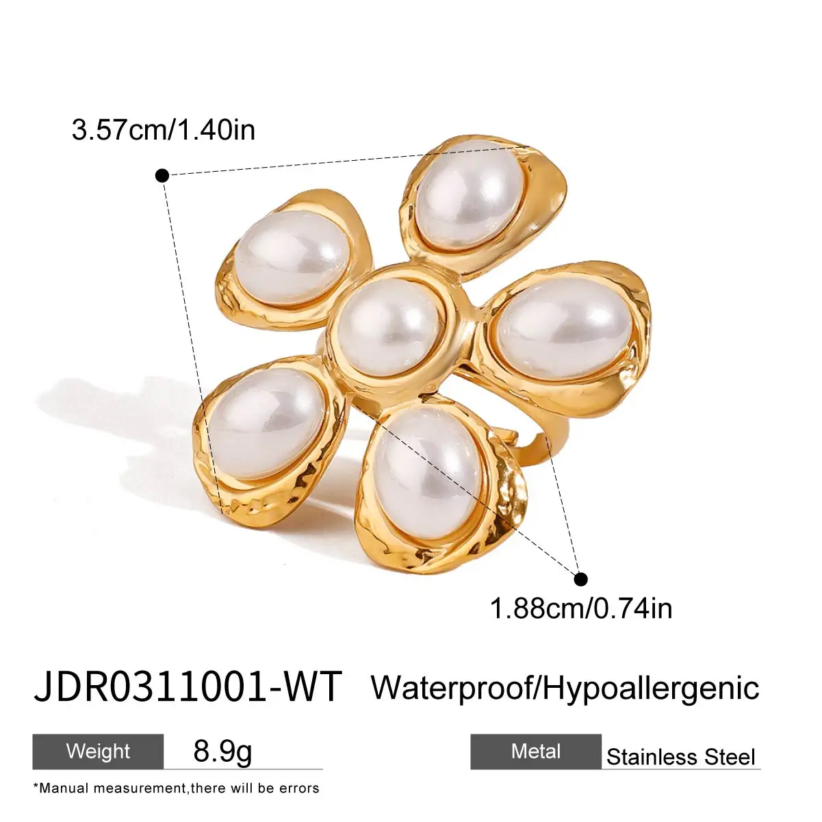 Step into elegance and confidence with this stunning gold flower ring, designed to elevate your everyday style or add sparkle to special occasions. Crafted from durable stainless steel and finished with PVD gold coating, this ring boasts long-lasting color and resists scratches, making it perfect for daily wear. Its bold flower motif features a central rounded element surrounded by six lustrous pearls, resembling petal-like accents that add a touch of sophistication and charm. The ring's open, adjustable design ensures a comfortable fit for all finger sizes, while its textured hammered edges provide a unique ornamental touch. Light yet impactful, this piece seamlessly blends fashion with longevity, making it an essential accessory for women who appreciate both style and quality.