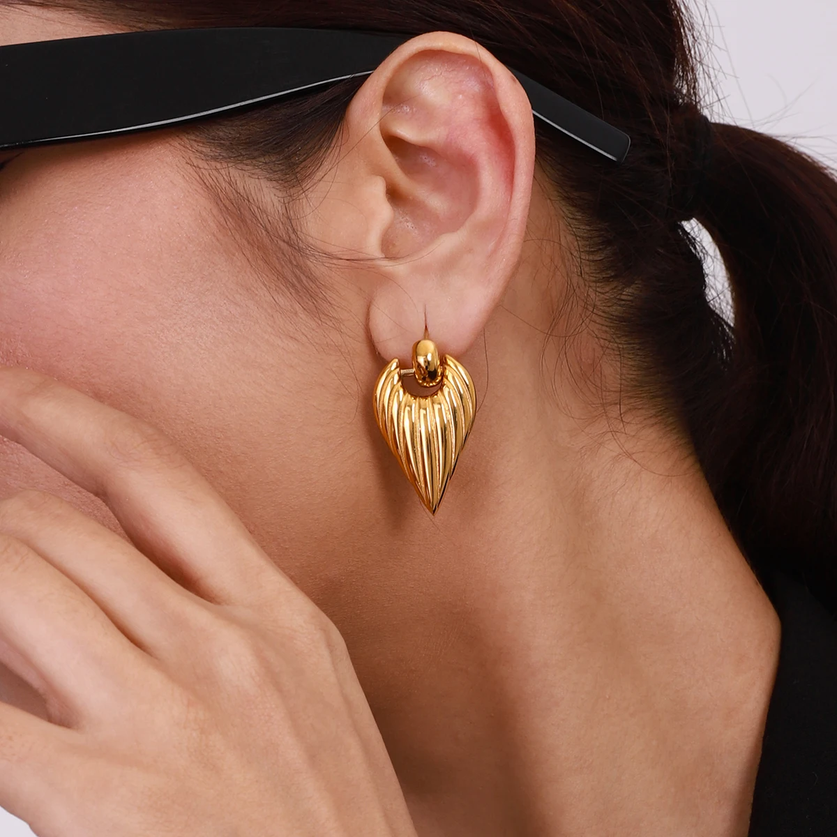 Elevate your everyday look with these stainless steel geometric heart-shaped earrings, finished in long-lasting PVD gold for a polished, luxurious appearance. Weighing just 15 grams, they are waterproof, hypoallergenic, and free from nickel, lead, and cadmium, making them comfortable and safe for daily wear. Featuring a bold, ribbed, curved pattern that resembles a stylized heart or leaf, these trendy stud earrings are perfect for adding a fashionable touch to any outfit, whether casual or special occasion. Designed with push-back findings for secure wear, these earrings combine craftsmanship and style, making them an essential addition to your jewelry collection.