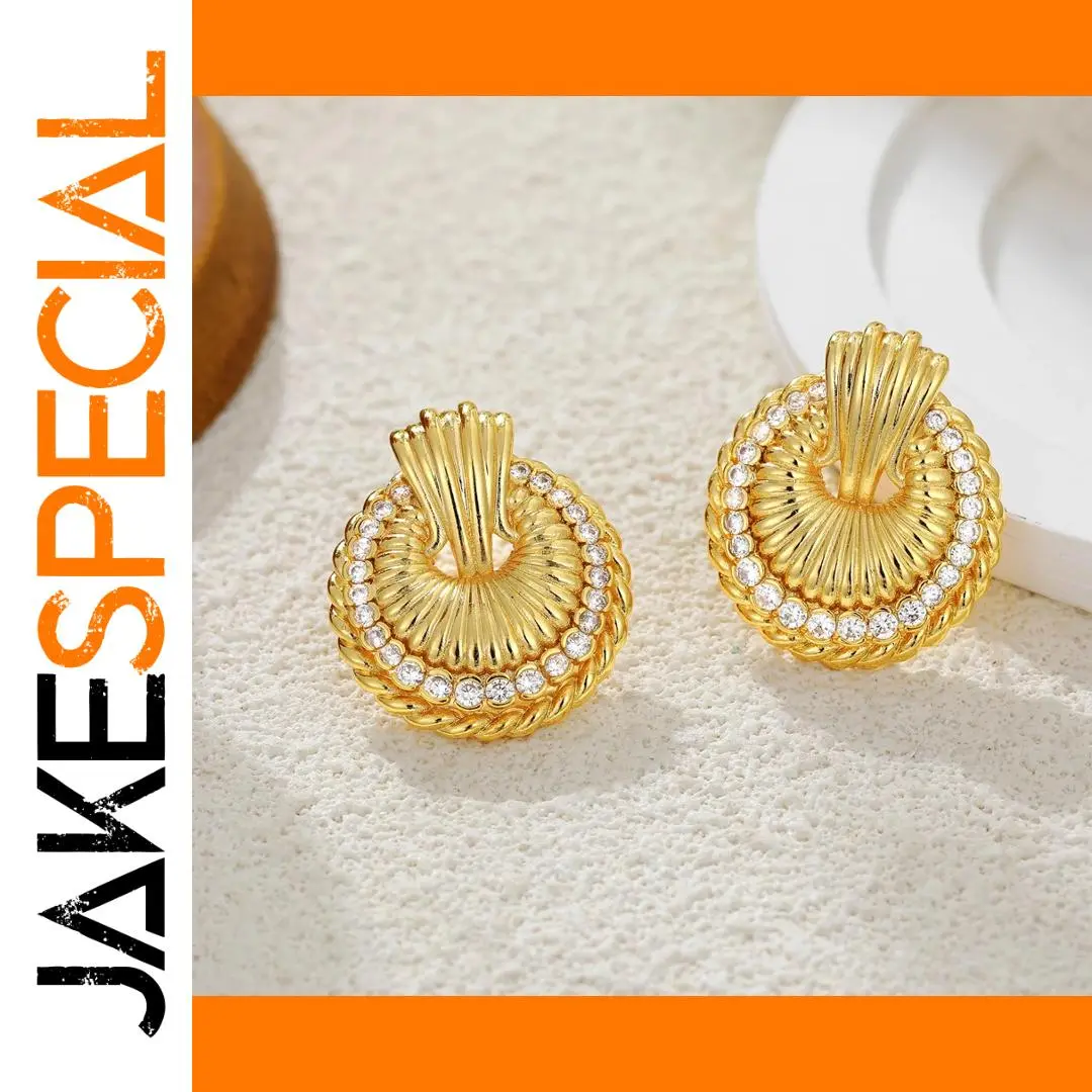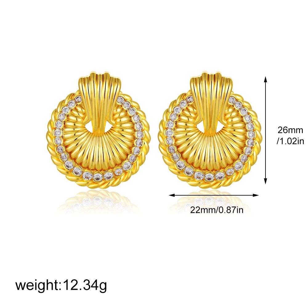 Step into a world of sophisticated style with this pair of this elegant gold stainless steel geometric earrings. Designed for women who love bold, fashionable accessories, these earrings combine a chunky, round shape with a luxurious gold-tone finish. The layered, ridged texture creates captivating depth, while the shimmering zircon border adds a touch of brilliance. The vertical, ribbed fan-like detail at the top introduces a gothic-inspired element, making these earrings perfect for trendy, stylish occasions. The polished surface reflects light beautifully, enhancing your look instantly. Whether you're dressing up for a party, celebrating an anniversary, or enjoying a casual date, these earrings will elevate your outfit with their unique design and radiant appeal. Comfortable and striking, they are sure to become your favorite jewelry piece.