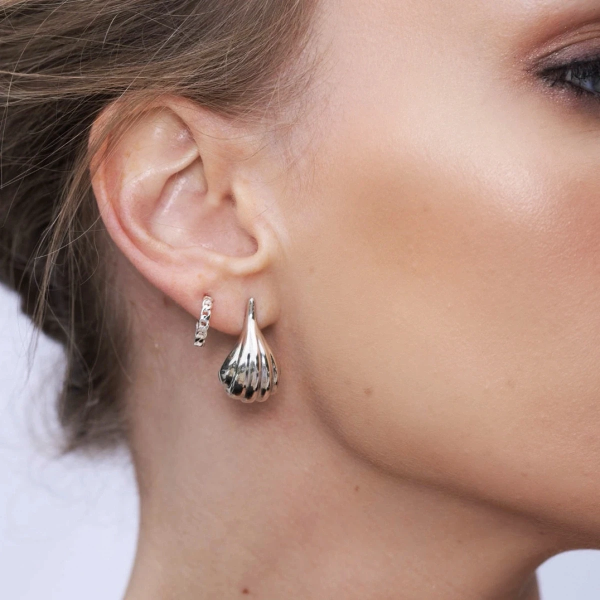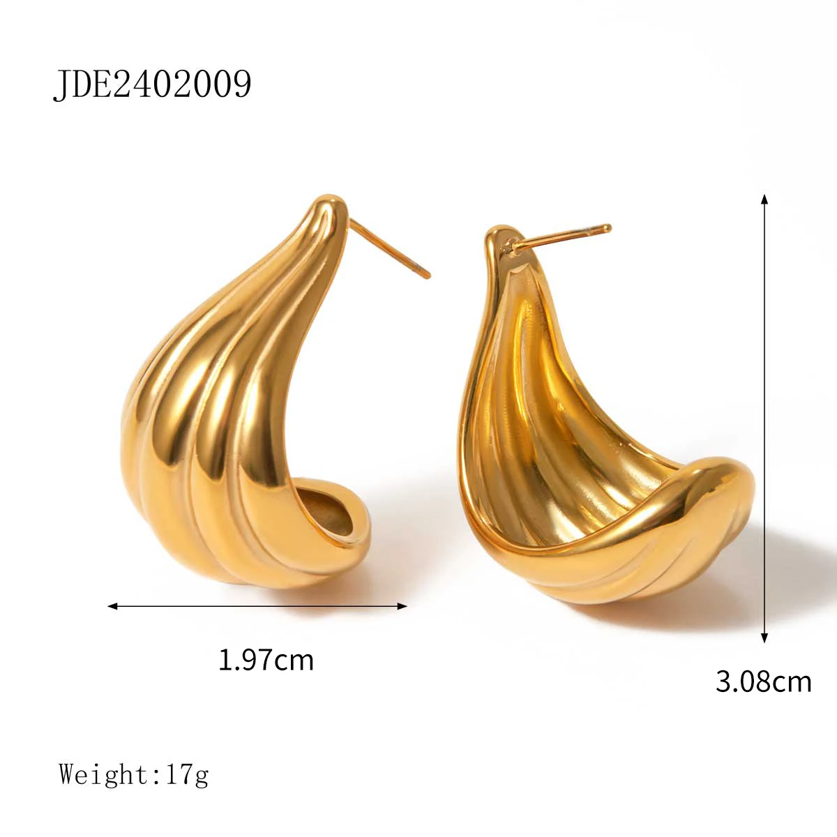 Experience the contemporary elegance of these irregular geometric hoop earrings, crafted from durable stainless steel with a luxurious PVD gold coating. Their unique flowing, sculptural shape mimics folded ridges, creating a dynamic, artistic look. The polished, shiny surface reflects light beautifully, emphasizing the modern, avant-garde design. With substantial, rounded forms that taper slightly at points, these earrings stand out as a bold statement piece that enhances any outfit. Weighing approximately 15 grams each, they are comfortable yet substantial, perfect for adding a touch of sophisticated edge to your style. Waterproof, long-lasting, and free of allergens, they are an ideal choice for those seeking high-quality, fashionable accessories.