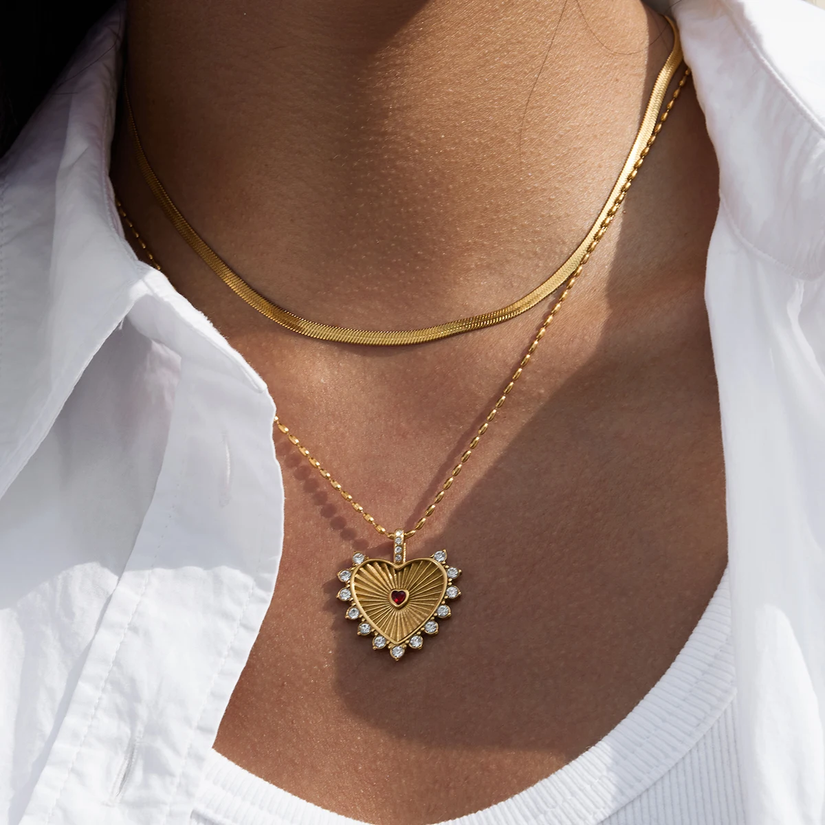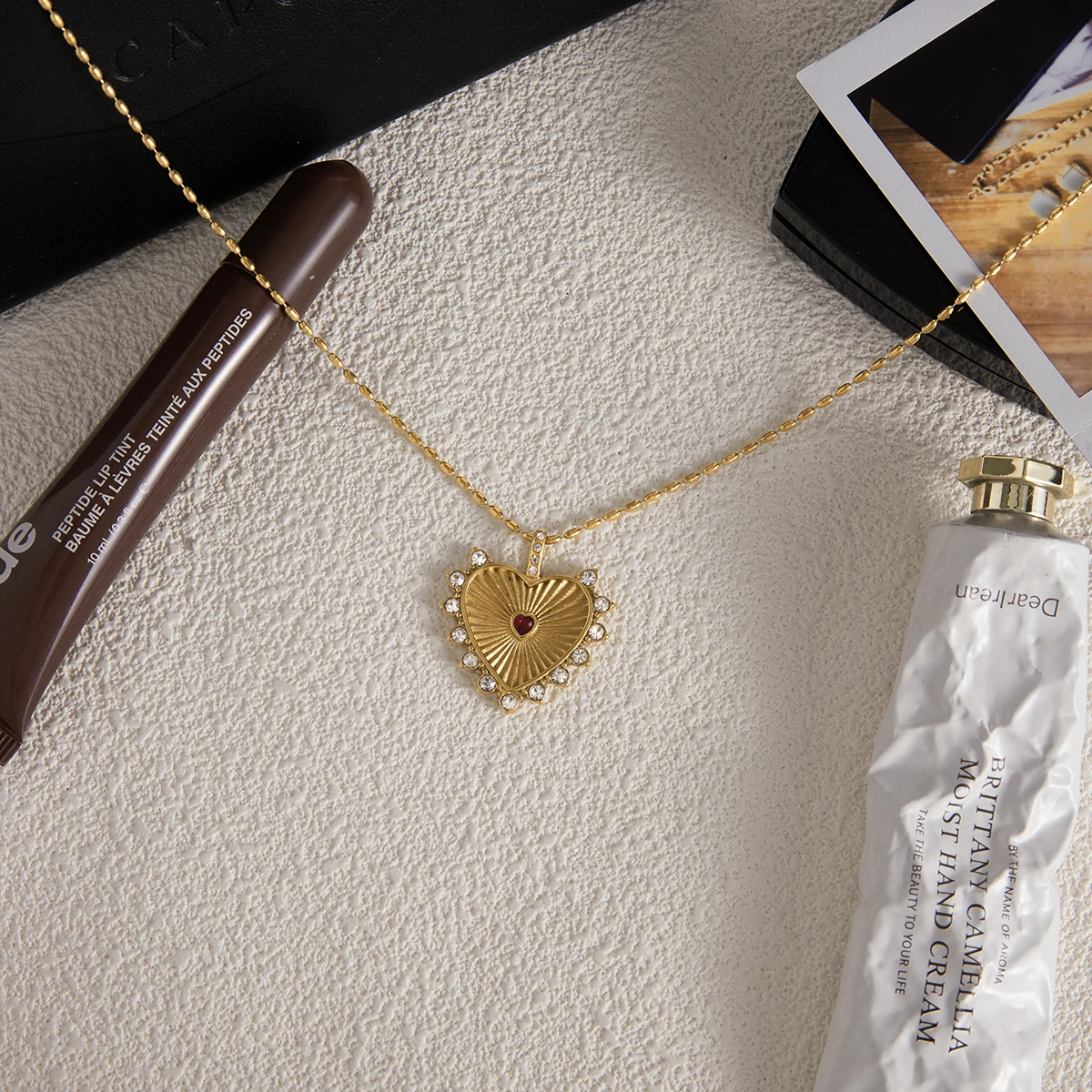 Enhance your jewelry collection with this trendy stainless steel pendant necklace featuring a striking gold-colored heart-shaped pendant. Crafted with a ribbed design and adorned with vibrant red rhinestones at the center, the pendant showcases intricate detailing and a shimmering border of sparkling rhinestones set in a dainty loop. The fine link chain offers a comfortable fit, perfect for various occasions such as birthdays or casual outings. Model number JDN0107001 (with a secondary variant JDN0304037), this REACH-certified piece combines elegance and style, making it a versatile addition for women seeking a fashionable and eye-catching accessory.
