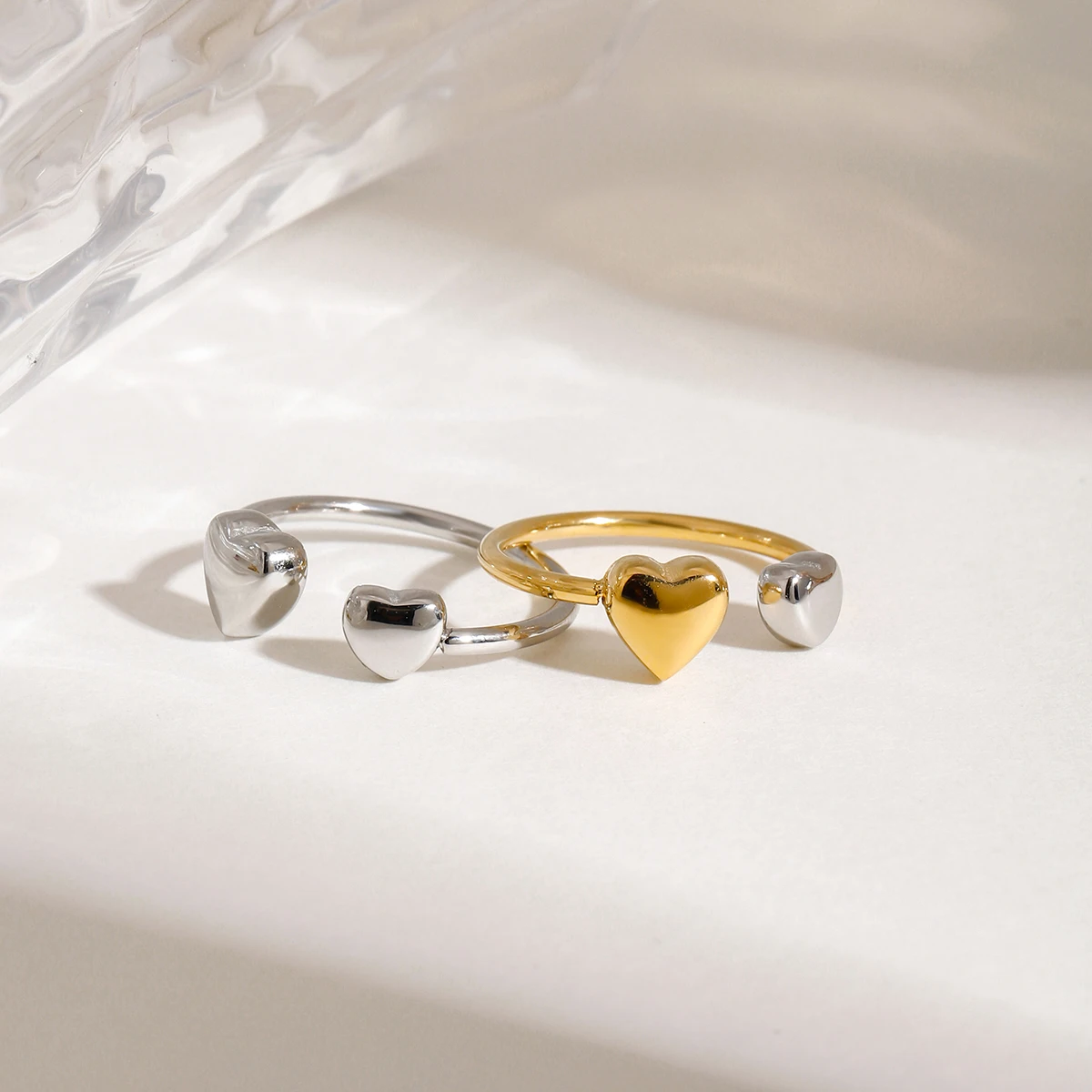 Experience the perfect blend of minimalism and modern elegance with this stunning gold stainless steel heart ring. Featuring a sleek 2mm wide band with a smooth, polished surface, it showcases a simple yet eye-catching heart-shaped charm. Designed for women, its adjustable fit ensures comfort and versatility, making it an ideal accessory for daily wear or special occasions like anniversaries. The PVD gold coating guarantees long-lasting color, resistance to scratches and fading, and a waterproof quality that keeps your jewelry pristine over time. Whether you’re layering with other rings or wearing it alone, this piece adds a subtle romantic touch to any outfit. It embodies contemporary style with durable, high-quality materials for lasting beauty.