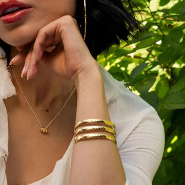 - Multi-layered cuff design with a sleek, polished texture for a contemporary look. The layered structure gives it a bold silhouette while remaining lightweight and comfortable for daily wear.