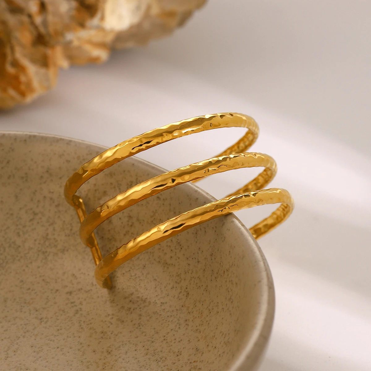 Experience the refined beauty of this this stainless steel cuff bracelet, designed to add a touch of sophistication to your everyday or special occasion look. Its multi-layered structure creates a bold statement, with several parallel, slightly curved bands that evoke a sense of depth and modern elegance. Coated with PVD gold, this piece maintains its bright, luxurious hue over years of wear, resisting fading, scratches, and tarnishing. Its smooth, polished surface catches the light beautifully, making every movement shimmer with subtle grace. Weighing just 15 grams, it offers a comfortable fit for all-day wear, exemplifying both style and durability. Perfect for those who wish to feel confident and stylish effortlessly.