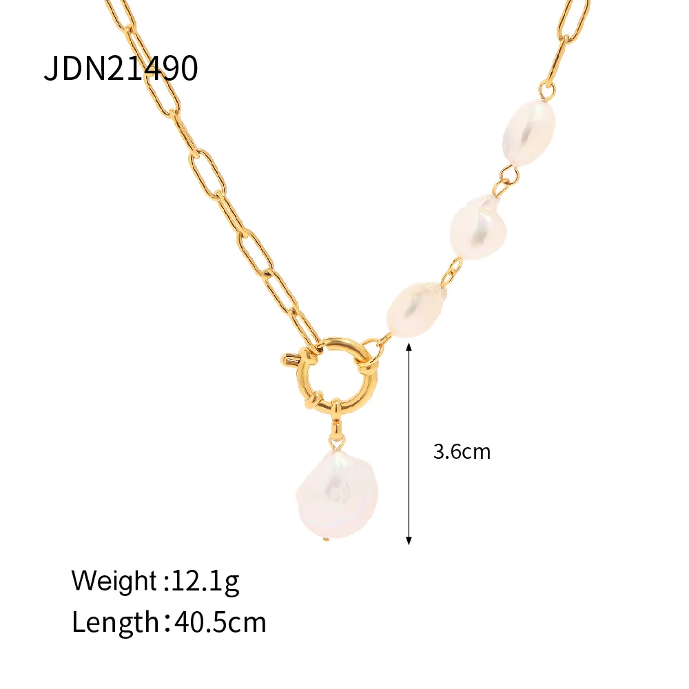 - Technical specifications include a necklace length of approximately 394 mm, a 63 mm extension, total weight of 15 grams, and made with corrosion-resistant stainless steel and PVD gold coating tests.